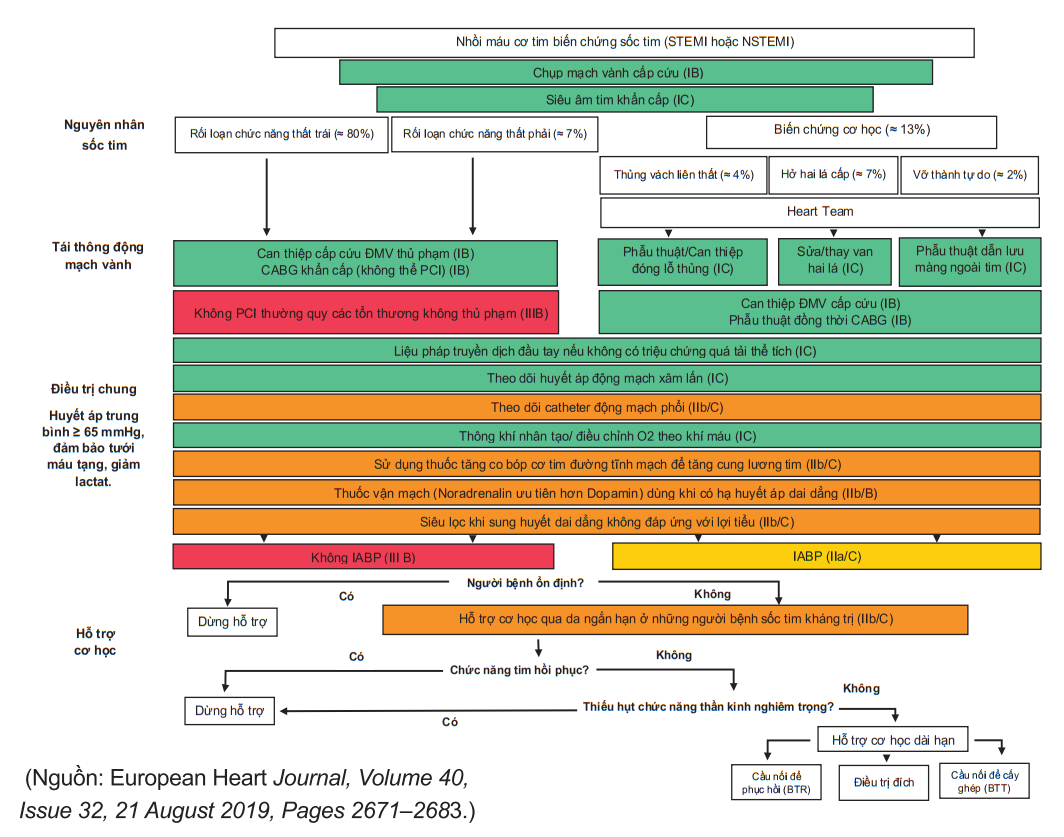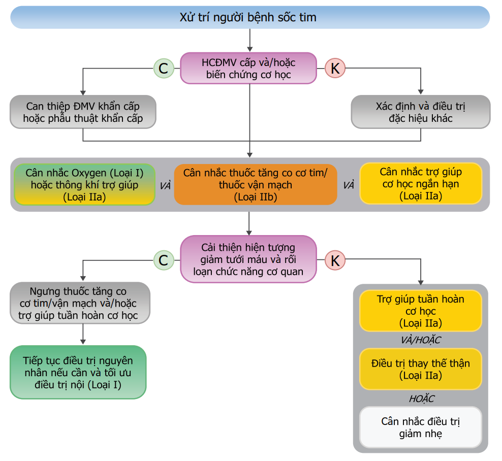 Ở những người bệnh hội chứng vành cấp biến chứng sốc tim phù hợp, hỗ trợ tuần hoàn cơ học ngắn hạn có thể được xem xét; phụ thuộc vào tuổi, bệnh đồng mắc, chức năng thần kinh, kỳ vọng sống và chất lượng cuộc sống. IIb C