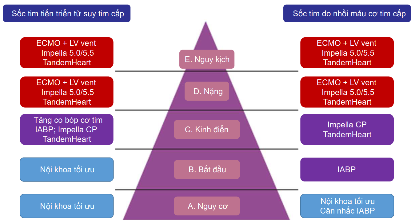 Bệnh cảnh lâm sàng là AMI – CS hay ADHF – CS: điểm cốt lõi trong AMI – CS là giảm tải tâm thất, vì thế bắt đầu hỗ trợ tuần hoàn cơ học được khuyến cáo sớm hơn ở người bệnh sốc tim do nhồi máu cơ tim cấp (giai đoạn A. Nguy cơ) so với sốc tim tiến triển từ suy tim cấp (giai đoạn C. Kinh điển), nhằm mục đích giảm thiểu tối đa nguy cơ suy sụp huyết động, đảm bảo tưới máu cơ quan đích, tạo thuận lợi cho quá trình can thiệp, sau đó có thể lên thang theo diễn biến lâm sàng.