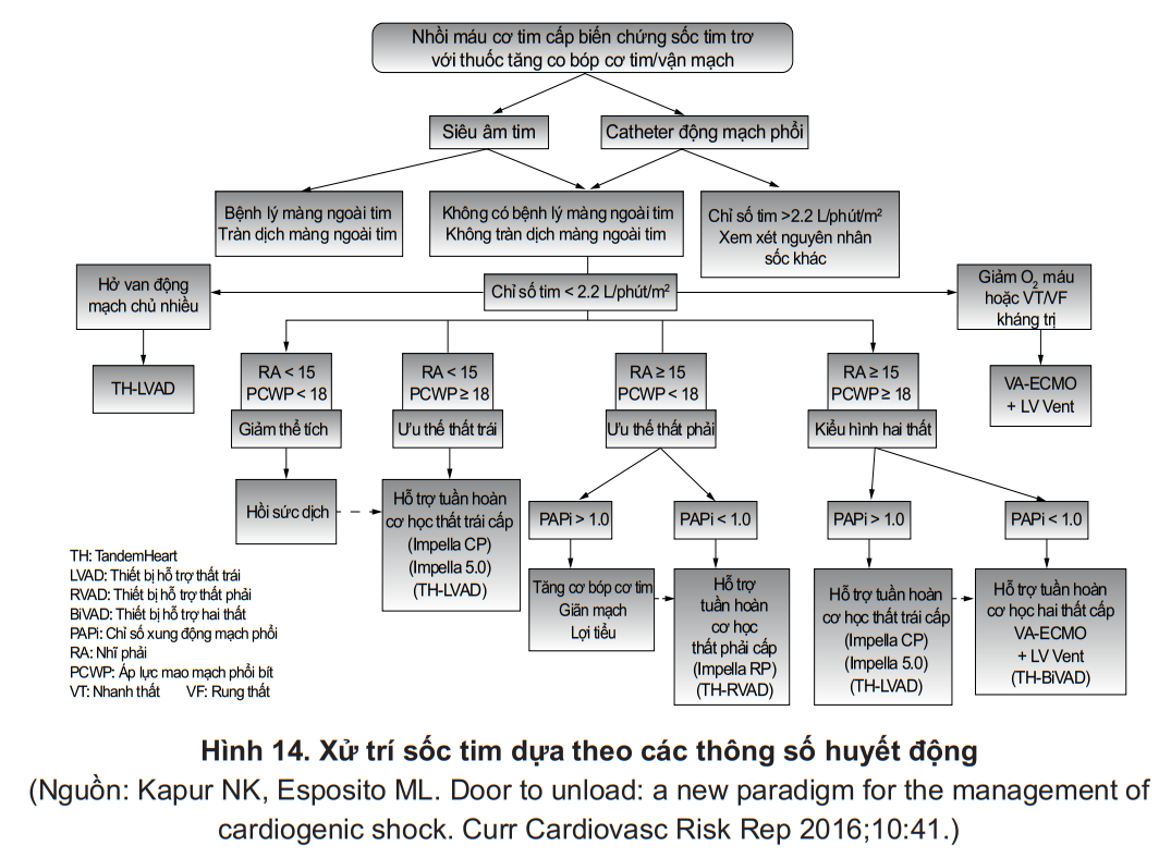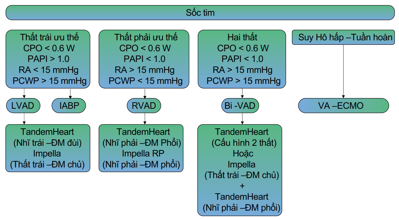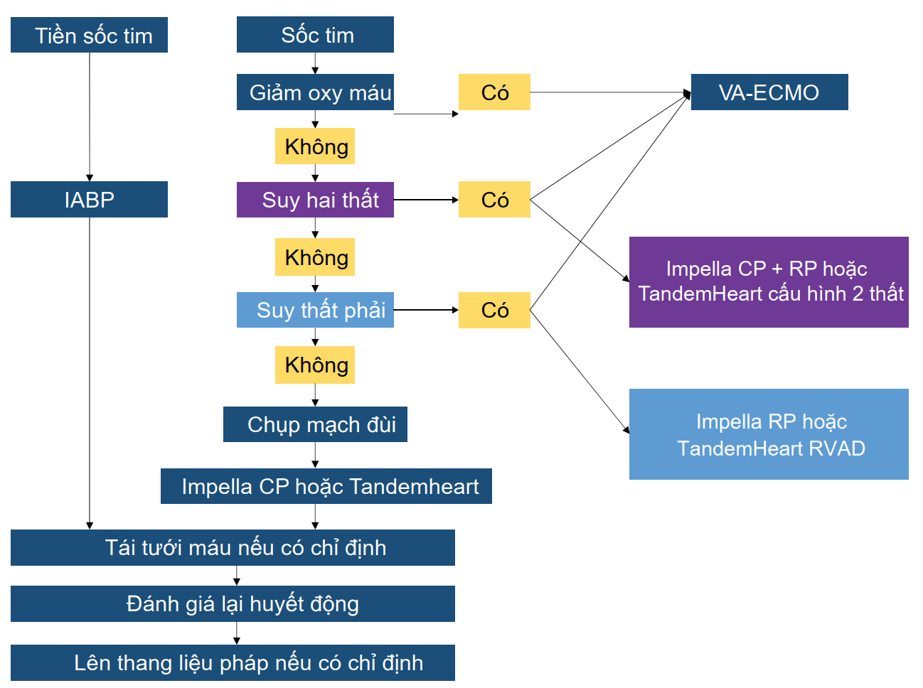 Lựa chọn thiết bị cơ học trong sốc tim phải dựa trên tâm thất cần hỗ trợ. Thăm dò huyết động giúp xác định tâm thất suy ưu thế, từ đó có các thiết bị tương xứng. Trong trường hợp suy giảm oxy hóa máu nặng, VA-ECMO được ưu tiên hơn so với các thiết bị khác do có khả năng thay thế hoàn toàn hệ thống tim – phổi; tuy nhiên, trong nhồi máu cơ tim – sốc tim, sử dụng VA-ECMO có nhược điểm làm tăng hậu gánh thất trái, tăng áp lực cuối tâm trương thất trái, tăng nguy cơ hình thành huyết khối buồng tim, phù phổi cấp; vì thế cần thiết phải giảm áp thất trái bằng dẫn lưu thất trái hoặc kết hợp với một thiết bị giảm hậu gánh thất trái.