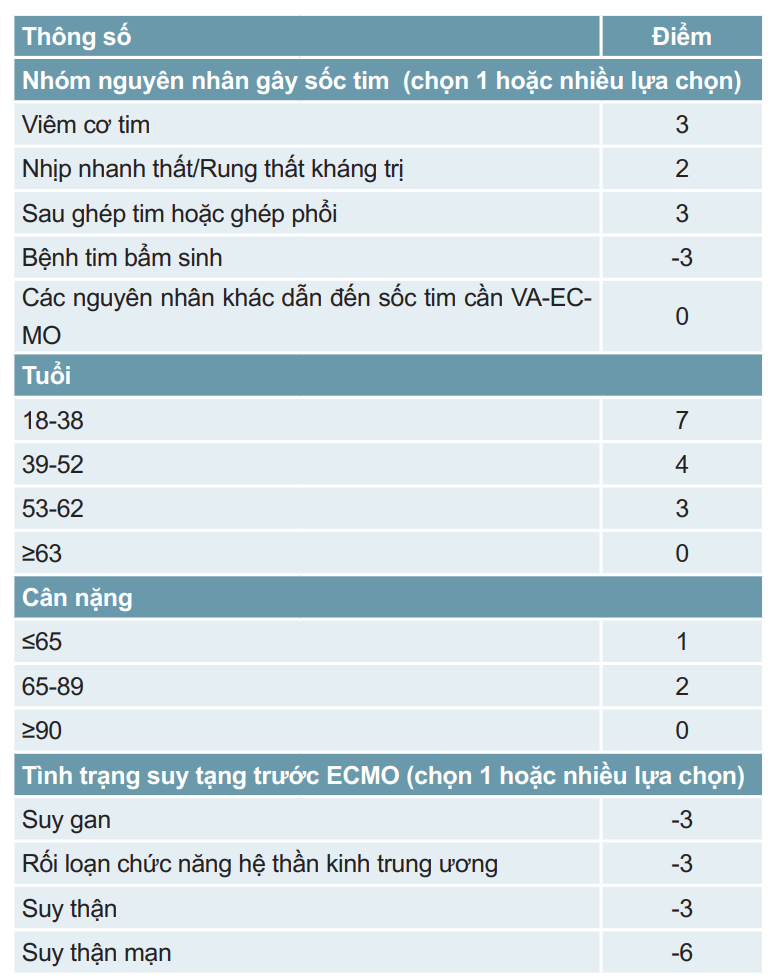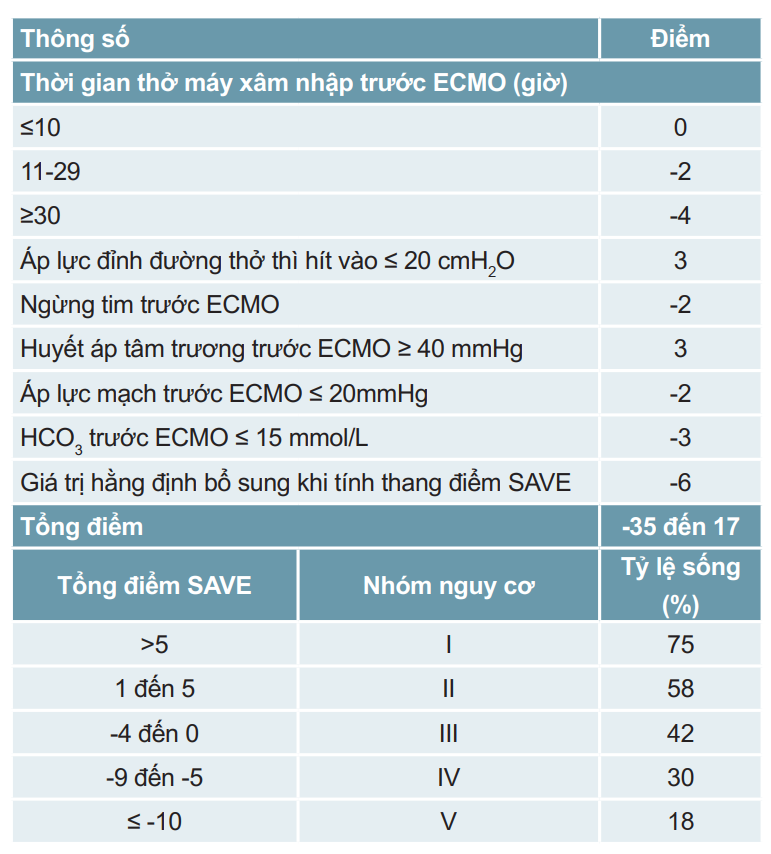 Ngoài ra, có thể áp dụng thang điểm SAVE để tiên lượng và cân nhắc quyết định VA-ECMO cho người bệnh