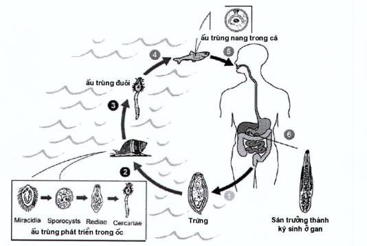 (5)Giai đoạn phát triển trên người hoặc động vật: Khi ăn phải cá có ấu trùng nang chưa được nấu chín thì sau khi ăn, ấu trùng này vào dạ dày, xuống tá tràng rồi ngược theo đường mật lên gan, phát triển thành sán lá gan trưởng thành ký sinh và gây bệnh ở đường mật. Thời gian từ khi ăn phải ấu trùng nang trong cá đến khi thành sán trưởng thành từ 26-30 ngày.