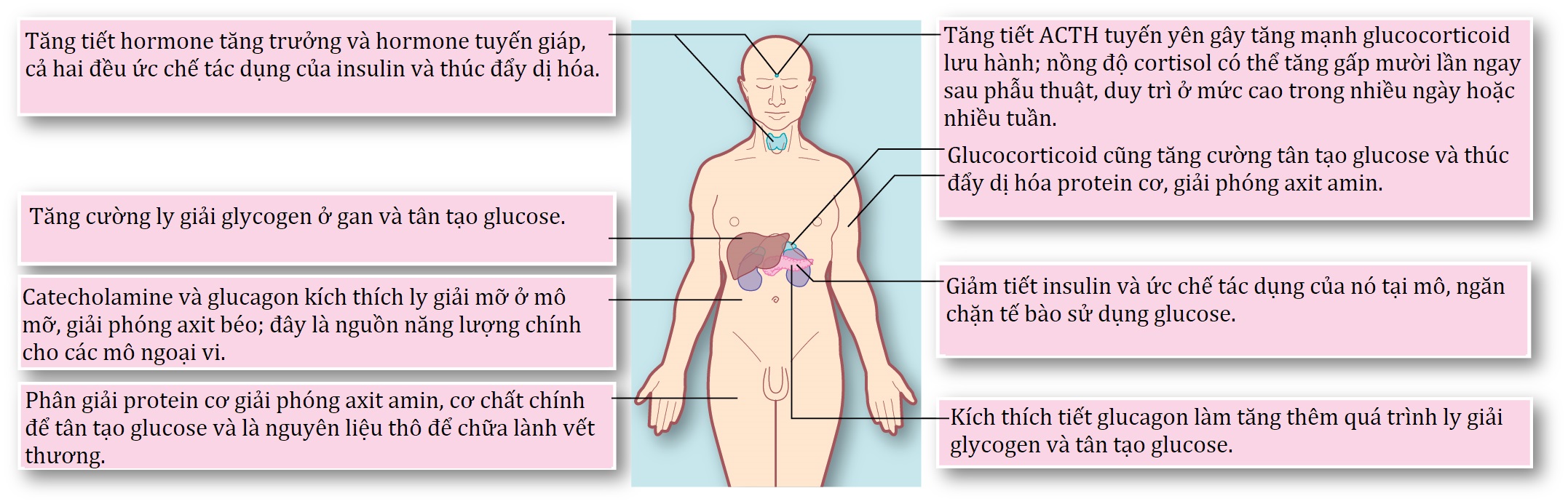 Sản xuất glucose được tăng lên nhờ quá trình tân tạo đường (gluconeogenesis) dưới ảnh hưởng của catecholamine và tình trạng kháng insulin (insulin resistance) tương đối phát triển, dẫn đến tăng đường huyết (hyperglycaemia). Sự gia tăng tiết ACTH, glucocorticoid (cortisol), glucagon và hormone tăng trưởng (growth hormone) góp phần vào trạng thái dị hóa chung. Những thay đổi chuyển hóa này được thể hiện trong Hình 2.1.