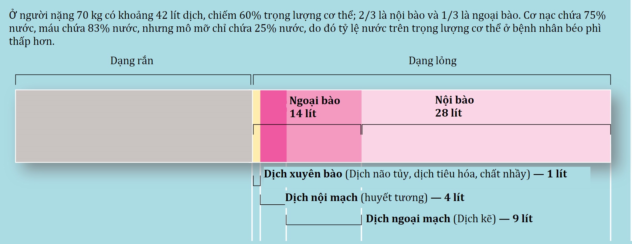 Cơ thể của một người trưởng thành trung bình 70 kg chứa 42 L dịch, được phân bố giữa khoang nội bào (intracellular compartment), khoang ngoại bào (extracellular space) và trong lòng mạch (Hình 2.2). Lượng dịch nhập chủ yếu qua đường uống và thức ăn. Lưu ý rằng khoảng 200 mL/ngày nước được tạo ra trong quá trình chuyển hóa. Lượng dịch mất bình thường ở người trưởng thành là từ 2.5 đến 3 L/ngày. Khoảng 1 L bị mất một cách không nhận biết được (insensibly) qua da và phổi, 1300-1800 mL được bài tiết qua nước tiểu (khoảng 60 mL/giờ hoặc 1 mL/kg mỗi giờ) và 100 mL bị mất qua phân. Khoảng 100-150 mmol ion natri và 50-100 mmol ion kali bị mất mỗi ngày qua nước tiểu, và điều này được cân bằng bởi lượng hấp thu qua chế độ ăn bình thường (Bảng 2.2).