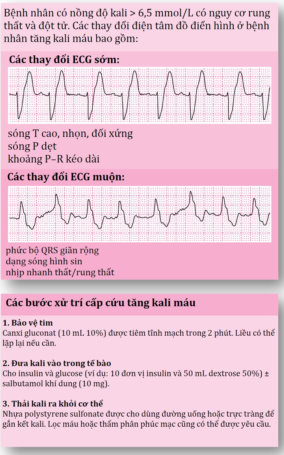 Tăng kali máu nhẹ không có triệu chứng nhưng ở mức độ cao hơn, nó liên quan đến loạn nhịp tim đe dọa tính mạng và ngừng tim. Xử trí cấp cứu tăng kali máu được trình bày trong Hình 2.3.