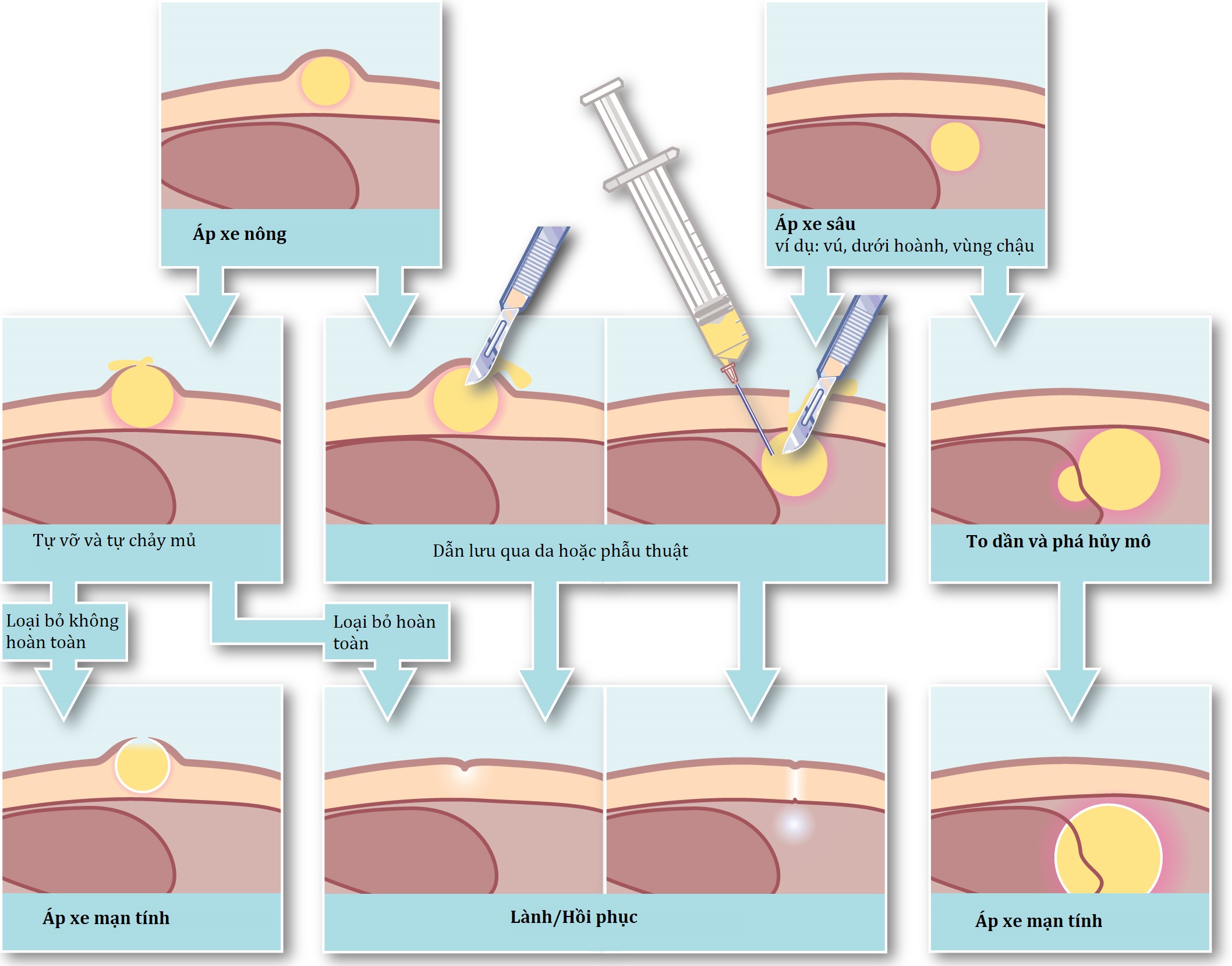 Xem phần Viêm mạn tính tại chỗ, ở phần sau của chương này. Bản chất của việc quản lý bất kỳ ổ áp-xe nào là thiết lập dẫn lưu hoàn toàn, thường bằng cách rạch hoặc chọc hút. Bất kỳ vật liệu hoại tử hoặc dị vật còn sót lại nào cũng cần được loại bỏ bằng cách nạo hoặc cắt bỏ. Nếu việc dẫn lưu áp-xe không loại bỏ được tác nhân gây hại, đáp ứng bạch cầu trung tính vẫn tồn tại và mủ tiếp tục được hình thành, dẫn đến áp-xe mạn tính (chronic abscess).