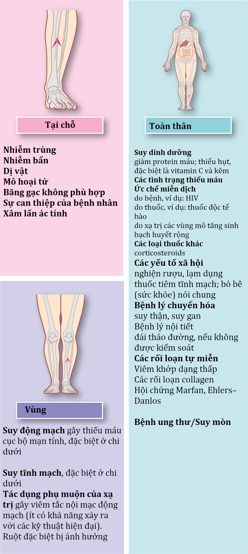 Tốc độ và sự thành công của quá trình lành thương có thể bị cản trở bởi nhiều yếu tố tại chỗ, tại vùng và toàn thân (Hình 3.5).