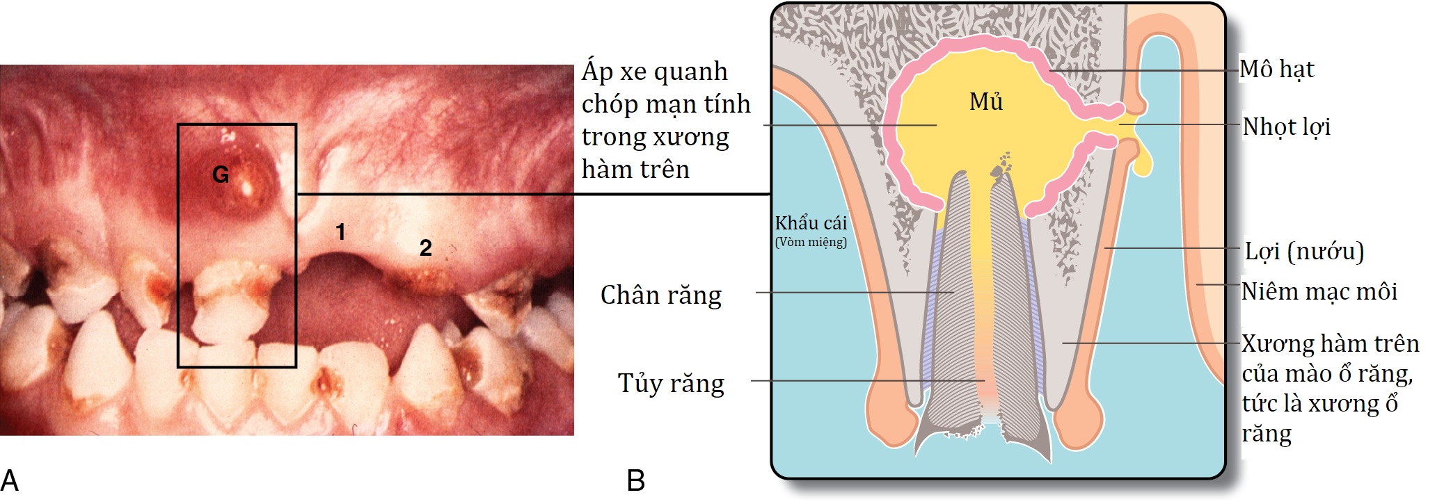 Hình 3.6 ‘Nướu sưng’ (gum boil) là một ví dụ về áp-xe mạn tính. (A) Miệng bị bỏ bê nặng cho thấy sâu răng lan rộng. Có một khối sưng viêm ở mặt má của xương ổ răng (G) gây ra bởi áp-xe chóp răng mạn tính ở răng cửa bên phải hàm trên. Lưu ý răng cửa giữa bên trái (1) bị mất và răng cửa bên trái (2) đã bị gãy ngang mức nướu do sâu răng. (B) Mặt cắt đứng dọc qua ‘nướu sưng’ (2) của một răng cửa hàm trên. ‘Nướu sưng’ thực chất là một đường rò trên nướu, chảy mủ mạn tính hoặc không liên tục. Bị phơi nhiễm với nhiễm khuẩn, tủy răng đã trở nên hoại tử trong khi áp-xe chóp răng đang từ từ mở rộng do sự hiện diện liên tục của mô hoại tử bị nhiễm khuẩn (tức là tủy răng). Chân răng là tất cả những gì còn lại sau khi thân răng đã bị gãy do sâu răng.