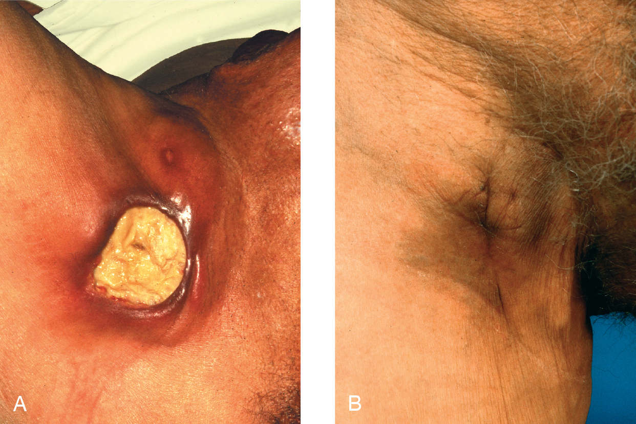 Hình 3.7 Loét do lao. (A) Bệnh nhân này đã sống ở Nam Phi và đã phát triển vết loét không đau và to ra chậm này khoảng 3 tháng trước đó. Nó bắt nguồn từ các hạch bạch huyết bị nhiễm khuẩn gần đó và cho thấy hình ảnh điển hình của ‘đáy loét màu da lộn’ (wash leather base) và ‘bờ loét nham nhở’ (undercut edge). Chẩn đoán dựa trên sinh thiết và điều trị bao gồm dẫn lưu các hạch bạch huyết liên quan có thể nhìn thấy phía trên vết loét và một liệu trình hóa trị liệu kháng lao. (B) Tổn thương đã lành 2 tháng sau đó.