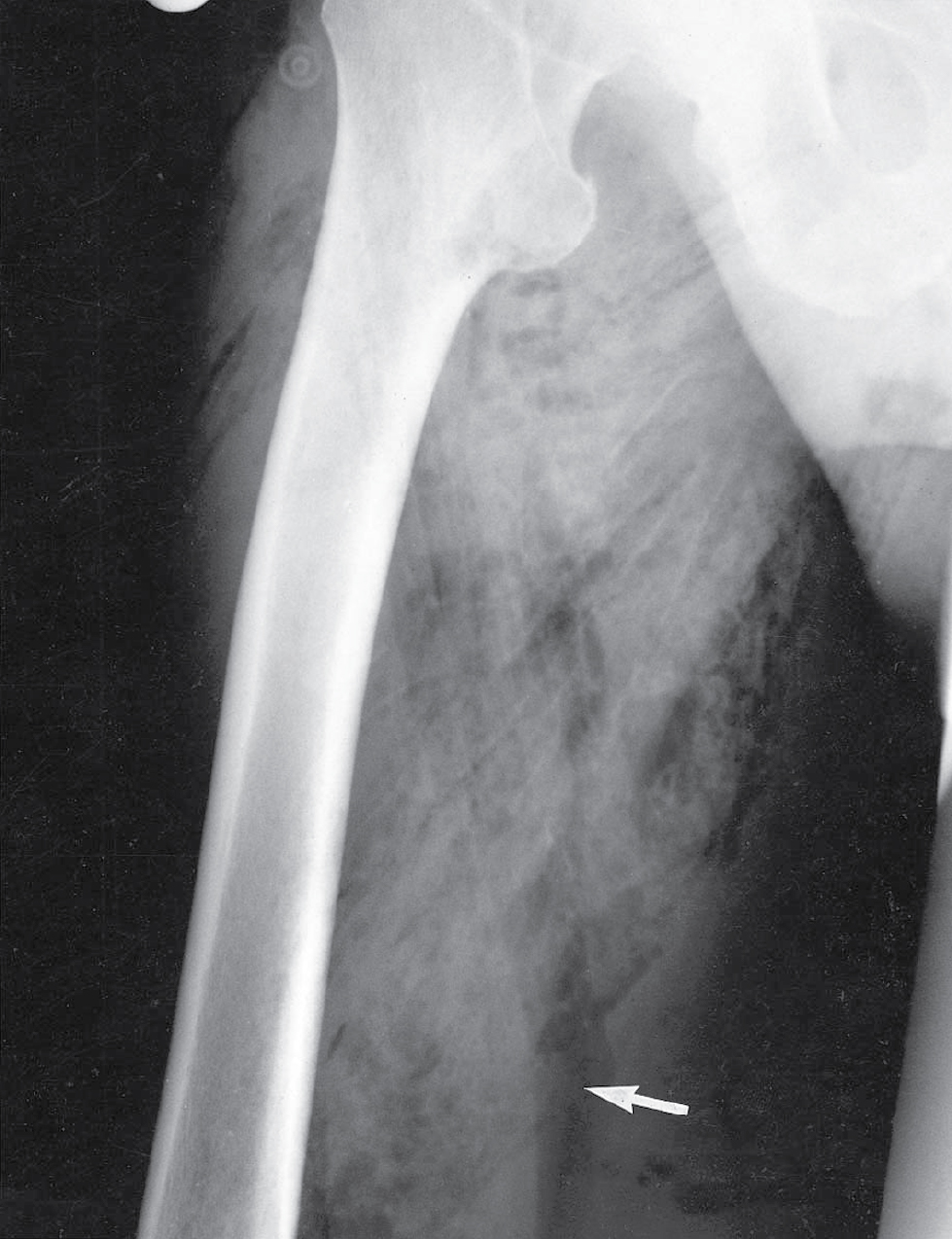 Hình 3.8 Hoại thư sinh hơi. Người đàn ông 46 tuổi này bị các vết rách rộng, bị ô nhiễm ở mặt trong đùi phải (mũi tên) trong một vụ va chạm giao thông đường bộ. Hoại thư sinh hơi đã phát triển, nhanh chóng liên quan đến tất cả các cơ của đùi vì tình trạng này không được nhận ra sớm và mô cơ hoại tử không được cắt bỏ ngay lập tức và hoàn toàn. Lưu ý các vệt bong bóng khí thấu quang (radiolucent) lan rộng dọc theo các mặt phẳng cơ. Bệnh nhân này đã tử vong vì nhiễm độc (toxaemia) mặc dù đã dùng kháng sinh, phẫu thuật và liệu pháp oxy cao áp.