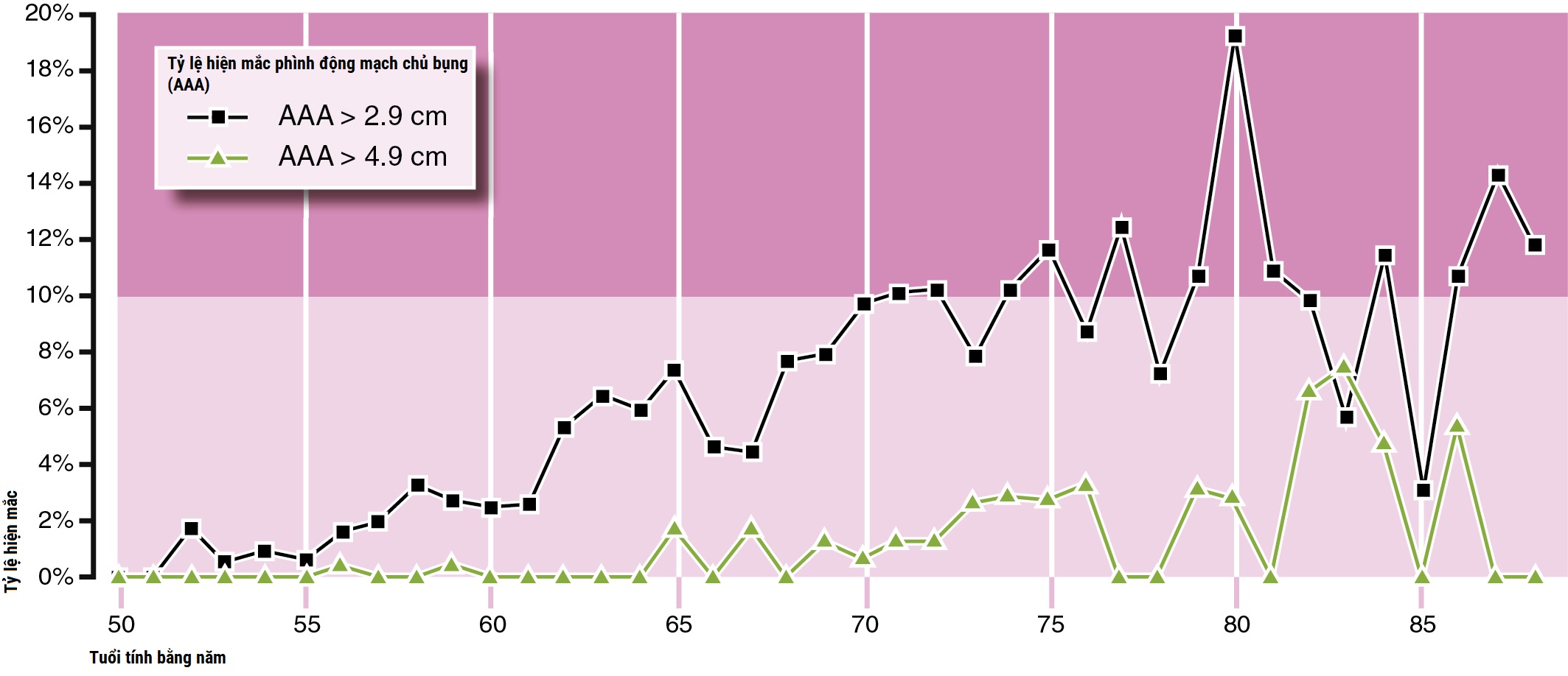 Nghiên cứu Huntingdon Trong nghiên cứu Huntingdon, 15,000 nam giới từ 50 tuổi trở lên đã được tầm soát trong 7 năm: 540 người được phát hiện có AAA ≥2.9 cm (29 mm), và 69 người có AAA ≥4.9 cm (49 mm) (Hình 6.1). Rất ít túi phình nhỏ và không có túi phình lớn nào được tìm thấy ở bệnh nhân dưới 60 tuổi, một yếu tố quan trọng khi lập kế hoạch tầm soát. Trên 70 tuổi, tỷ lệ mắc AAA nhỏ gần như là 10%. Trong nghiên cứu này, tỷ lệ tử vong do AAA cũng giảm 75% và số người cần mời để cứu một mạng người là 600.