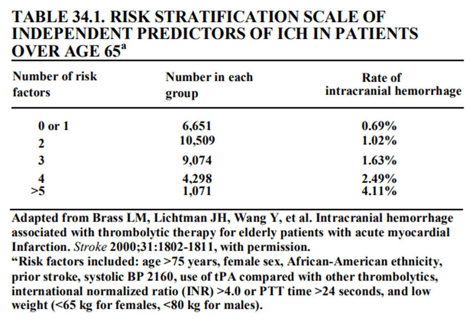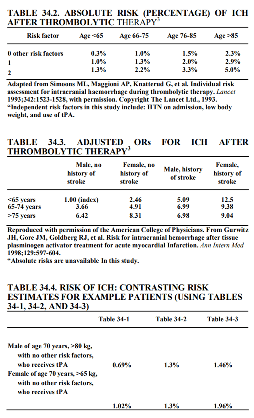 Bảng 34-1 tổng hợp hầu hết các dữ liệu gần đây về nguy cơ rõ ràng khi kết nối các yếu tố nguy cơ nhỏ lại với nhau, nhưng chỉ trên những bệnh nhân trên 65 tuổi. Những điều dưới đâyliên quan độc lập với xuất huyết não: TUổi trên 75 , giới nữ , người Mỹ gốc Phi , đột quỵ trước đó, Huyết áp tâm thu ³ 160mmHg, sử dụng tPA kết hợp với thuốc tiêu sợi huyết khác, INR³ 4 hoặc tăng thời gian PTT hơn 24s, và cân nặng thấp (< 80 kg cho nam) Bảng 34-2cho thấy các nguy cơ rõ ràng ở các nghiên cứu cũ hơn, nhỏ hơn. Bảng 34-3 chỉ cho thấy sự điều chỉnh OR, phải phối hợp với một tỷ số nguy cơ để đạt được một tỉ lệ nguy cơ rõ ràng cho bất kỳ bệnh nhân nào. TUy nhiên, bảng này cho phép tính toán nguy cơ trên bệnh nhân với một Tiền sử bị đột quỵ. Nguy cơ xuất huyết não của đàn ông dưới 65 tuổi mà không có Tiền sử đột quỵ được dùng tPA (chỉ số nguy cơ) là dưới 0,52% có lẽ 0,4%. ORx chỉ số nguy cơ = xấp xỉ nguy cơ đột quỵ