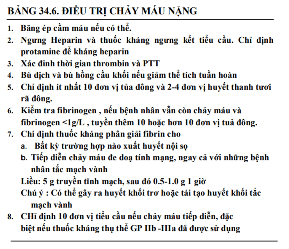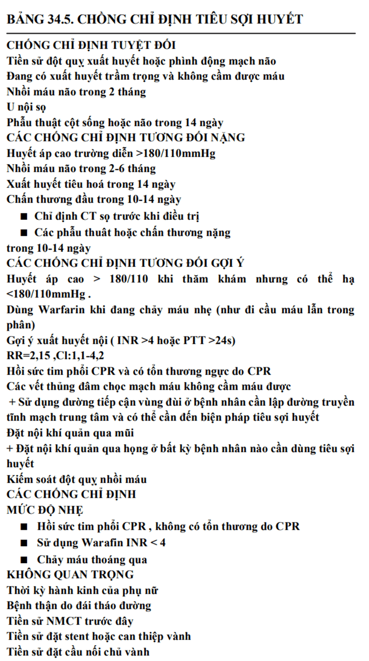 Bảng 34-5 liệt kê đầy đủ các chống chỉ định. Chú ý: Nguy cơ khi dùng tiêu sợi huyết trên phụ nữ có thai chưa được nghiên cứu.