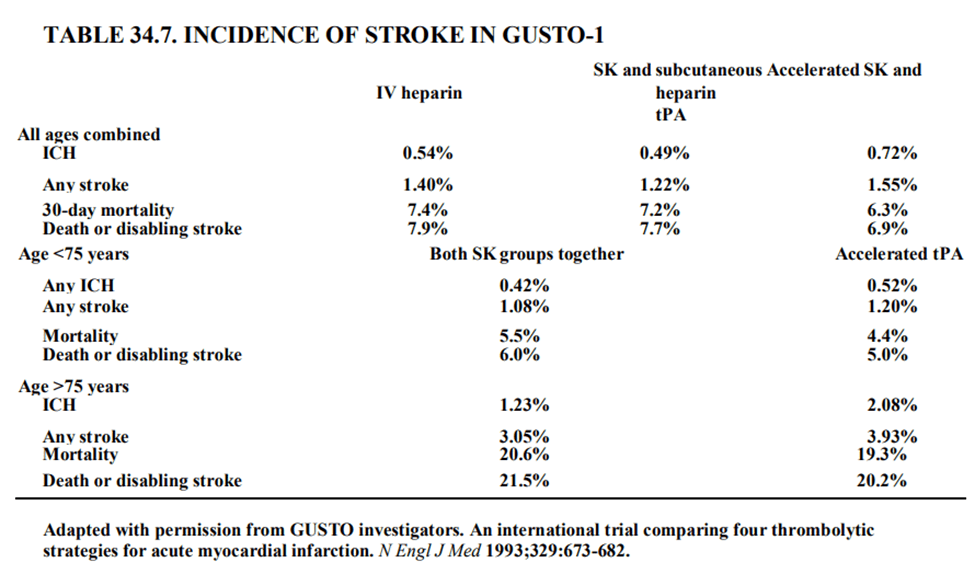 Phần lớn các dữ liệu so sánh giữa tiêu sợi huyết như một thuốc giả dược cho bệnh nhân bao gồm SK. Nhiều dữ liệu về ảnh hưởng và tác dụng của tPA phải được suy ra gián tiếp. Mặc dù biện pháp tiêu sợi huyết tăng nguy cơ đột quỵ xuất huyết , nó cũng giảm nguy cơ đột quỵ thiếu máu, gây nên do thuyên tắc não từ tim vì các huyết khối tại thành trong tim có thể do không được điều trị hoặc NMCT cấp hoàn toàn. Tổng quan tỷ lệ đột quỵ do tiêu sợi huyết (SK) là 4/1000,2 trong số 4 bệnh nhân đột quỵ này tử vong . Hơn nữa ,mặc dù tổng quan tỷ lệ đột quỵ không tử vong chỉ khoảng 2/1000 bệnh nhân được điều trị, nhưng tỷ lệ đột quỵ tàn tật khoảng 1/1000.Phụ thuộc vào thời gian từ triệu chứng tấn công, SK cứu khoảng 20-40 người/1000 bệnh nhân NMCT cấp được điều trị.Nghiên cứu LATE (chương 33) không tìm thấy bất kỳ bệnh nhân đột quỵ tàn tật nào do tPA trong 6 tháng.GUSTO -1 cho thấy 0,1% đột quỵ tàn tật không tử vong trong nhóm sử dụng tPA (0,6%) hơn nhón sử dụng SK (0,5%), mặc dù có 0,23% bệnh nhân chảy máu nội sọ ở nhóm tPA hơn. Kết nối những kết quả này với nhau, chúng ta ước lượng được tổng số đột quỵ tàn tật không tử vong khi sử dụng tPA khoảng 2/1000.Khi một người cho rằng gần 9 bệnh nhân được cứu/1000 bệnh nhân được chữa trị với tPA hơn với SK , có nghĩa là gần 30-48 bệnh nhân được cứu /1000 người được chữa trị với tPA ,tỷ lệ lợi ích/nguy cơ lớn của tPA được ghi nhận . Đối vói những bệnh nhân NMCT cấp vùng rộng, số lượng người được cứu sống với biện pháp tiêu sợi huyết lớn hơn 30 – 48 /1000 người được điều trị, với những bệnh nhân NMCT cấp vùng nhỏ hơn, con số này cũng thấp hơn