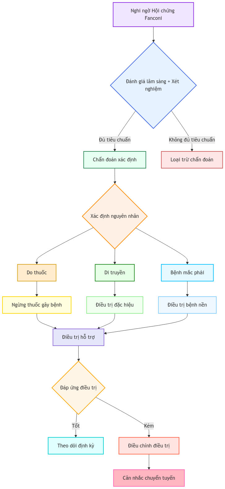 - Hội chứng Fanconi mắc phải do thuốc: Thường cải thiện sau khi ngừng thuốc gây bệnh, nhưng có thể mất vài tháng và không phải lúc nào cũng hồi phục hoàn toàn.