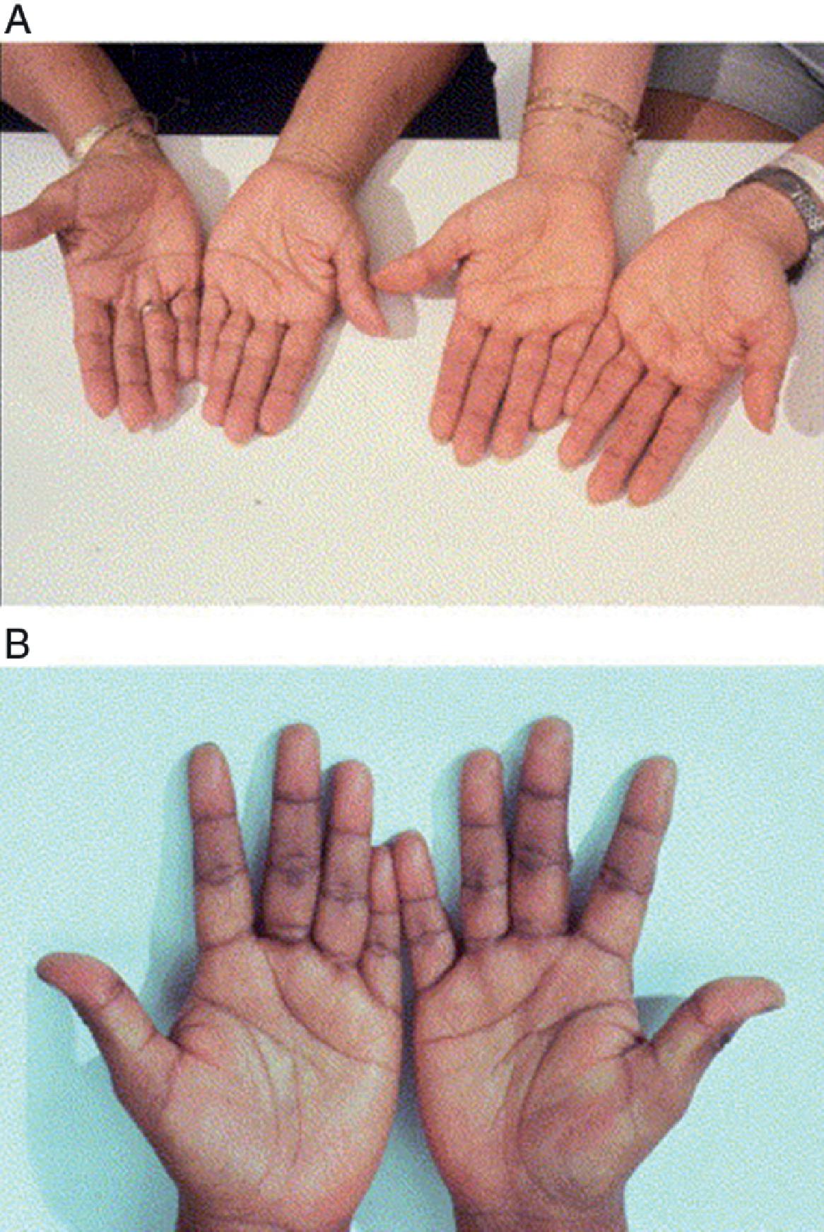 Một số đặc điểm trong biểu hiện của bệnh nhân STT cấp thay đổi tùy theo nguyên nhân và có thể là manh mối về nguyên nhân của STT (Bảng 14.3). Như đã đề cập trước đây, hạ natri máu và đặc biệt là tăng kali máu cho thấy STT nguyên phát. Bệnh nhân STT nguyên phát mạn tính có biểu hiện trong cơn suy thượng thận cấp có thể bị sạm da, xảy ra do tăng tiết ACTH mạn tính được tiết ra cùng với hormone kích thích tế bào hắc tố (MSH). Tình trạng sạm da này được thấy trong 41% đến 74% trường hợp, và rõ rệt nhất ở các nếp gấp lòng bàn tay và niêm mạc má, như được thể hiện trong Hình 14.1Hình 14.2.⁶,¹³,¹⁸,¹⁹
