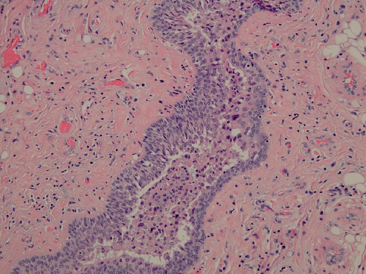 Hình 9.1 Hình ảnh vi thể của dịch rỉ viêm làm tắc lòng ống bài xuất. (Nhuộm Hematoxylin và eosin, độ phóng đại x200).