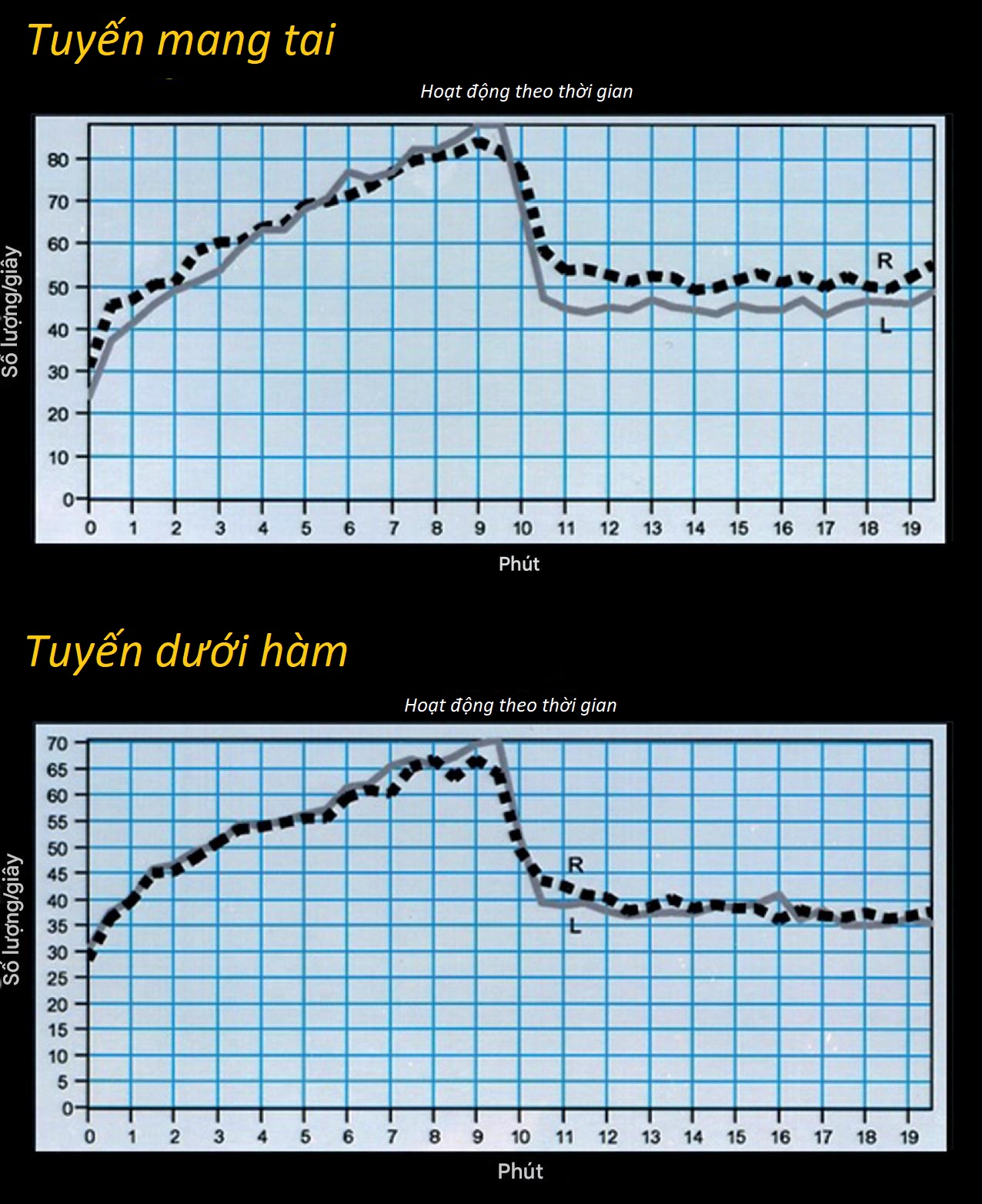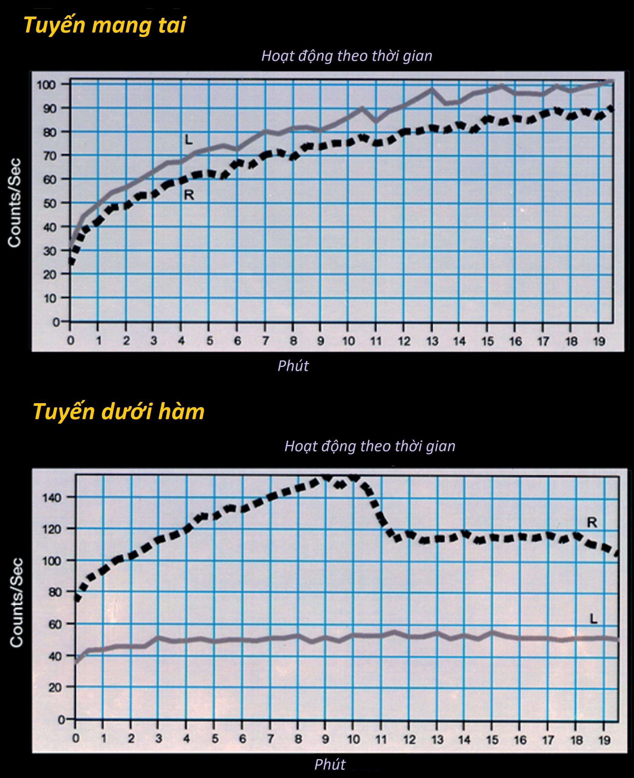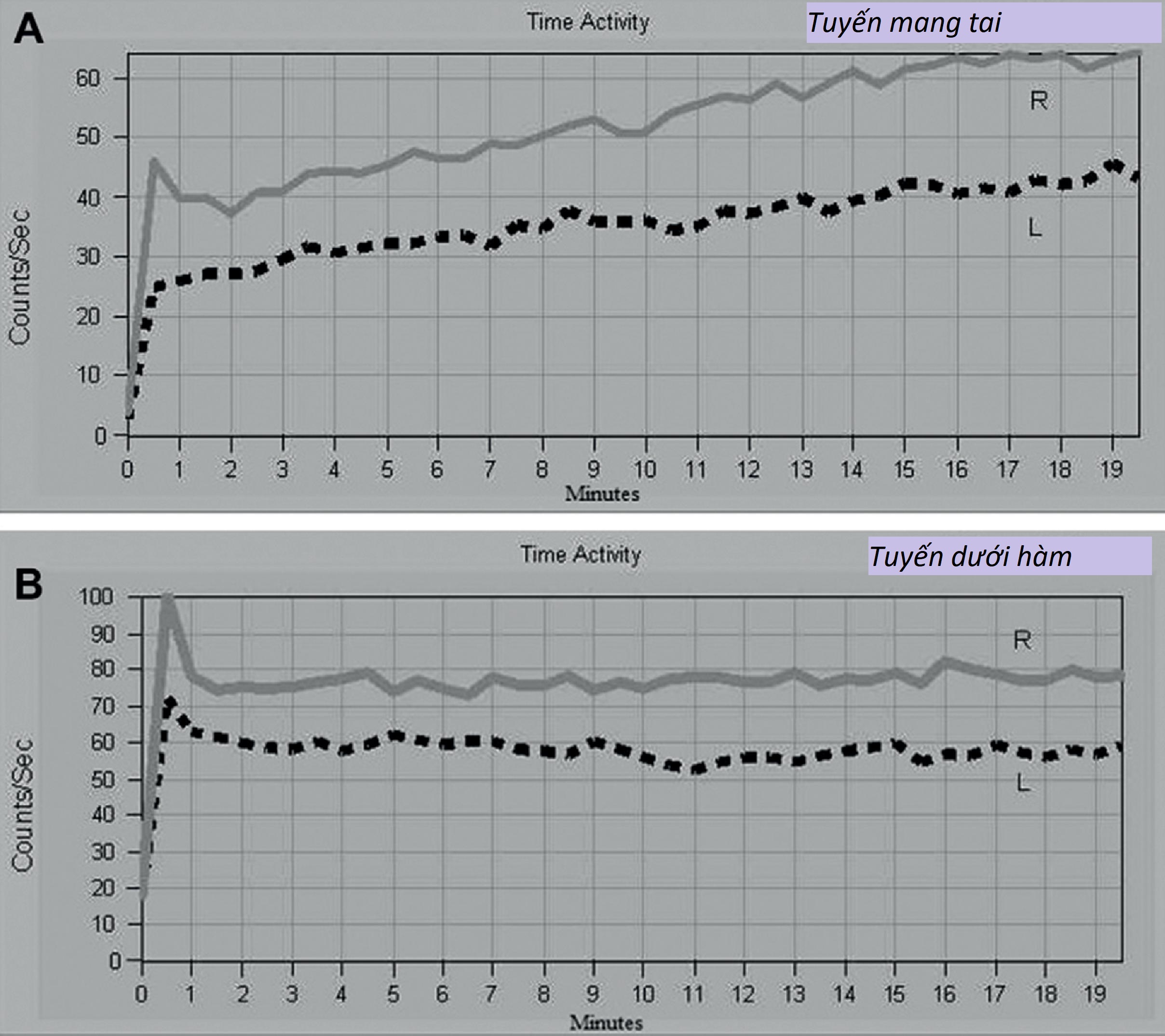 Hình 9.2 Bệnh án 9.1: Xạ hình được thực hiện 5 tháng sau khi bệnh nhân nhận 30 mCi I¹³¹ để hủy mô tuyến giáp. Tuyến nước bọt mang tai và dưới hàm bên phải (R) và bên trái (L) cho thấy sự hấp thu TPT bình thường. Sau khi kích thích bằng kẹo chanh ở phút thứ 10, sự bài tiết từ tất cả các tuyến nước bọt cũng được thấy là bình thường.