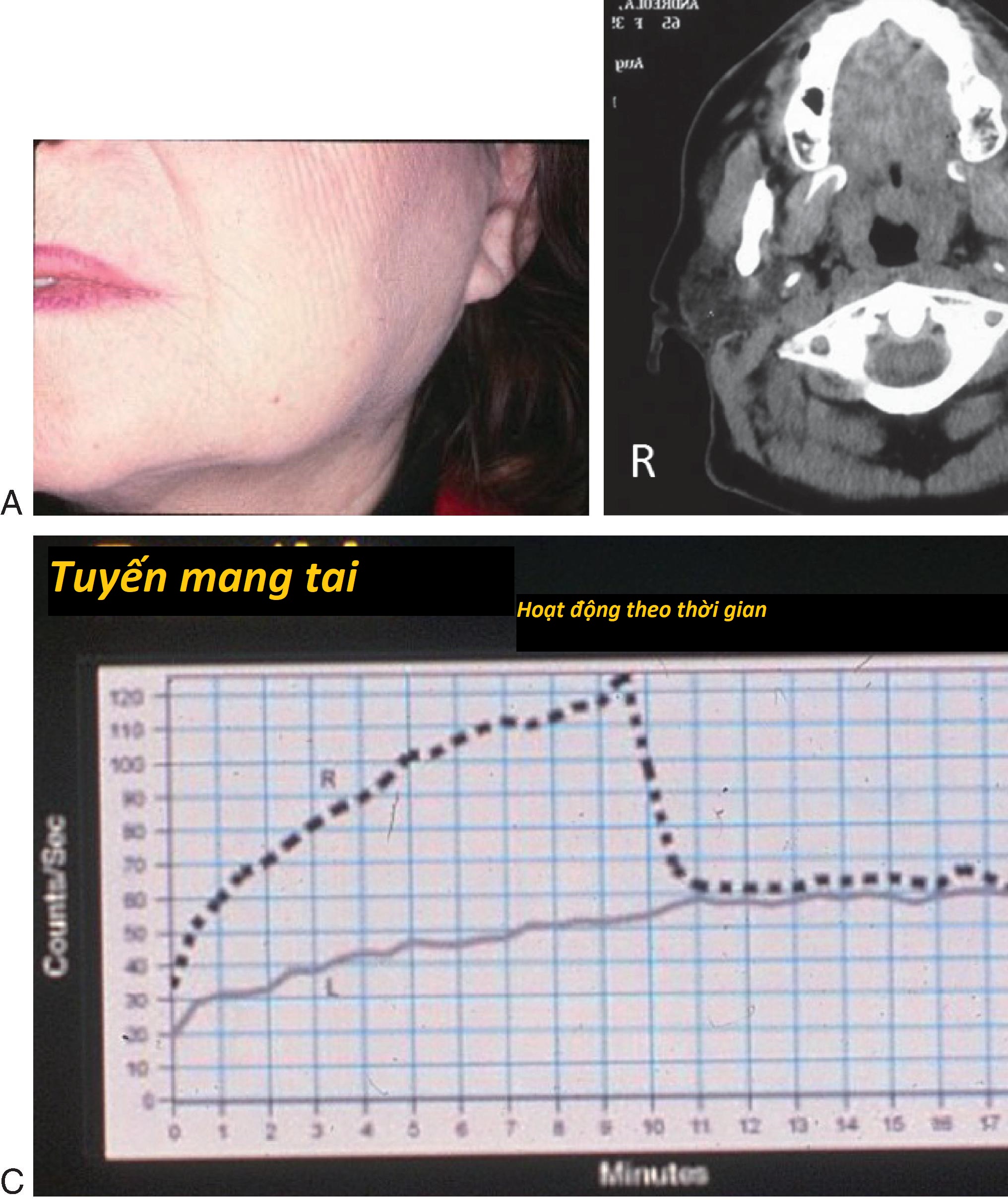 Hình 9.3 Bệnh án 9.2: (A) Bệnh nhân bị sưng tuyến mang tai trái 11 tháng sau khi nhận 75 mCi I¹³¹ sau khi cắt tuyến giáp vì carcinoma thể nhú. (B) Chụp CT cho thấy tuyến mang tai trái bị viêm. (C) Xạ hình: tuyến mang tai phải (R) cho thấy sự hấp thu và bài tiết TPT bình thường. Tuyến mang tai trái (L) cho thấy sự hấp thu chậm (do viêm tuyến) và không bài tiết (tắc nghẽn ống tuyến) TPT ở phút thứ 10. CT, Chụp cắt lớp vi tính; TPT, technetium 99m pertechnetate.
