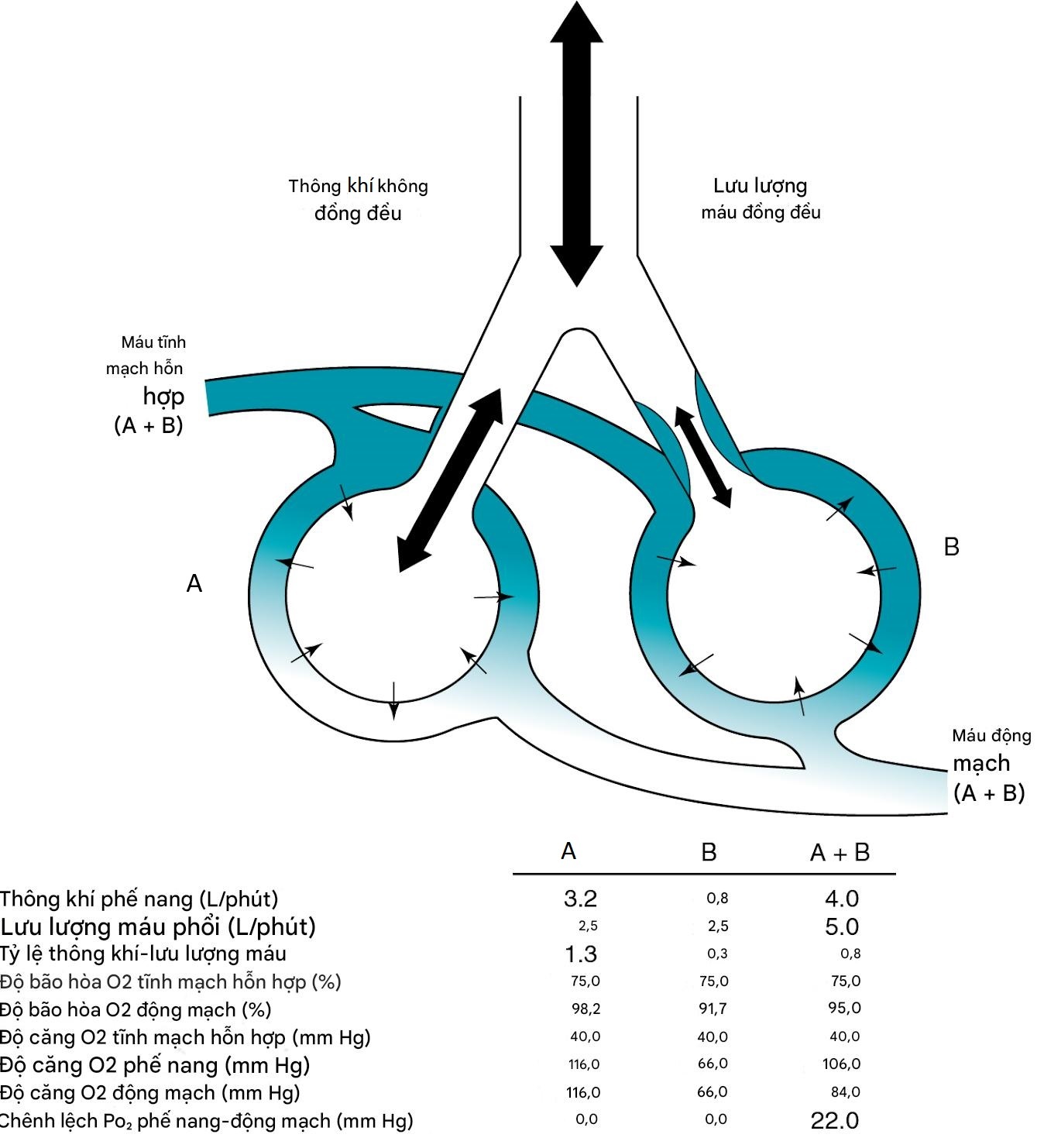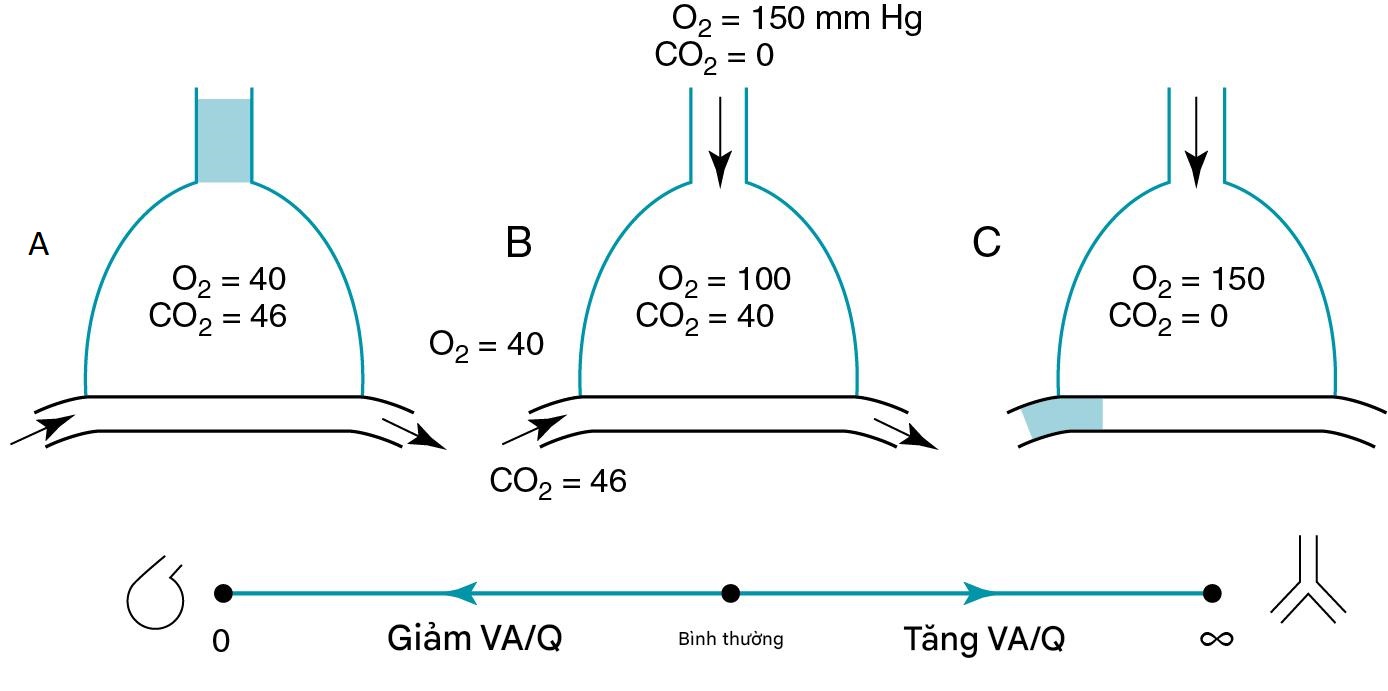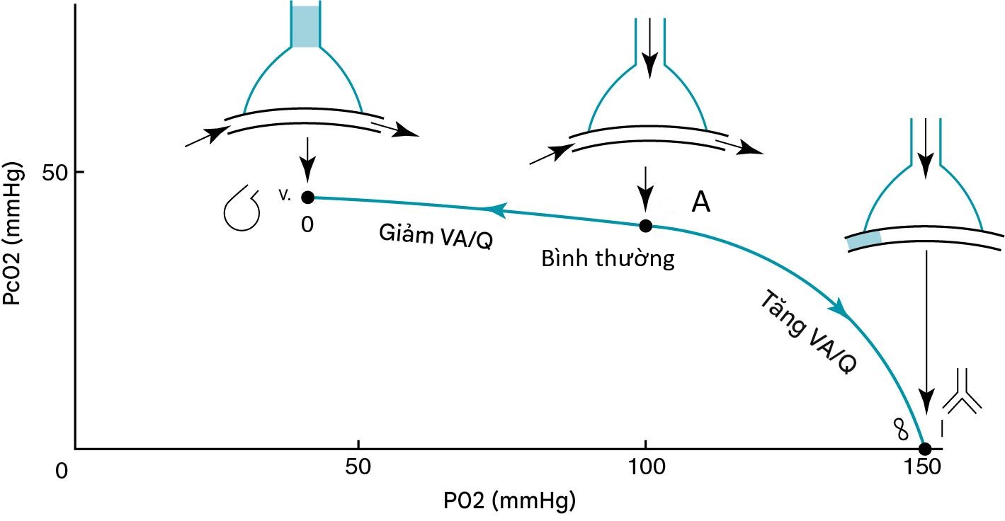 Hộp 1.5 động mạch () tỷ lệ nghịch với thông khí phế nang () và tỷ lệ thuận với sản xuất (). |