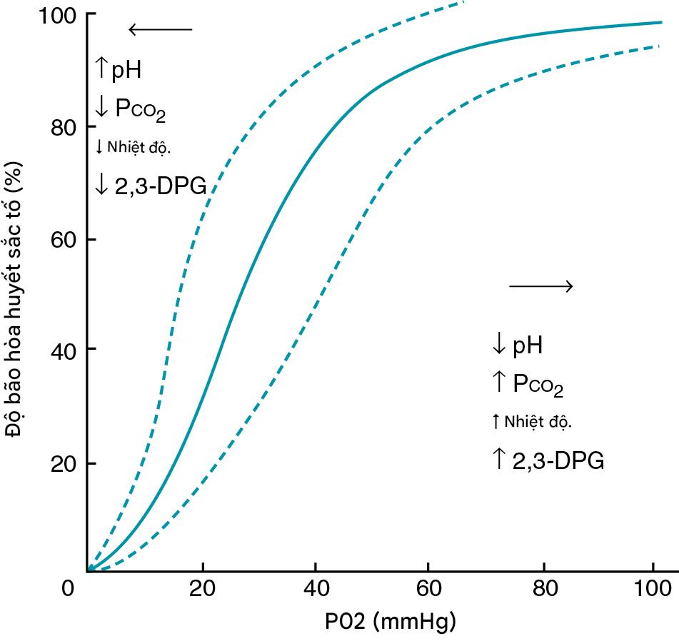 Đường cong này có thể dịch chuyển sang phải hoặc sang trái, tùy thuộc vào nhiều điều kiện khác nhau. Do đó, mối quan hệ giữa động mạch và độ bão hòa không cố định. Ví dụ, sự giảm pH hoặc tăng (chủ yếu do ảnh hưởng của pH), nhiệt độ, hoặc 2,3-bisphosphoglycerate (2,3-BPG; còn gọi là 2,3-diphosphoglycerate [2,3-DPG]) làm dịch chuyển đường cong phân ly oxyhemoglobin sang phải, làm cho việc giải phóng (hoặc khó liên kết hơn) dễ dàng hơn ở bất kỳ nào (xem Hình 1.5). Các thay đổi ngược lại về pH, , nhiệt độ, hoặc 2,3-BPG làm dịch chuyển đường cong sang trái và làm cho việc giải phóng (hoặc dễ liên kết hơn) khó khăn hơn ở bất kỳ nào. Những đặc tính này giúp đảm bảo rằng oxy được giải phóng ưu tiên cho các mô hoạt động chuyển hóa mạnh hơn vì quá trình chuyển hóa kỵ khí mạnh dẫn đến giảm pH và tăng 2,3-BPG, trong khi nhiệt độ và tăng được tạo ra bởi quá trình chuyển hóa hiếu khí mạnh.