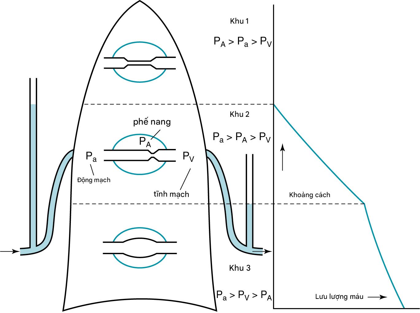 Tại đỉnh phổi (xem vùng 1 trong Hình 1.4), áp lực phế nang vượt quá áp lực động mạch và tĩnh mạch và không có dòng chảy nào xảy ra. Thông thường, một tình trạng như vậy không phát sinh trừ khi áp lực động mạch phổi giảm hoặc áp lực phế nang tăng (bằng áp suất ngoại sinh tác động lên đường thở và phế nang). Ở vùng 2, áp lực động mạch nhưng không phải áp lực tĩnh mạch vượt quá áp lực phế nang, và lực đẩy cho dòng chảy được xác định bởi sự khác biệt giữa áp lực động mạch và áp lực phế nang. Ở vùng 3, áp lực động mạch và tĩnh mạch vượt quá áp lực phế nang, và lực đẩy là sự khác biệt giữa áp lực động mạch và tĩnh mạch, như trường hợp trong tuần hoàn hệ thống.