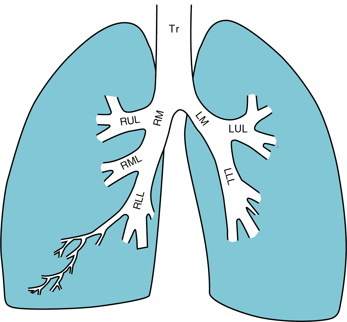 Hình 1.1. Sơ đồ phân nhánh đường thở. LLL, phế quản thùy dưới trái; LM, phế quản gốc trái; LUL, phế quản thùy trên trái; RLL, phế quản thùy dưới phải; RM, phế quản gốc phải; RML, phế quản thùy giữa phải; RUL, phế quản thùy trên phải; Tr, khí quản. Nang phổi bao gồm các cấu trúc sau tiểu phế quản tận: tiểu phế quản hô hấp, ống phế nang và phế nang (túi phế nang).