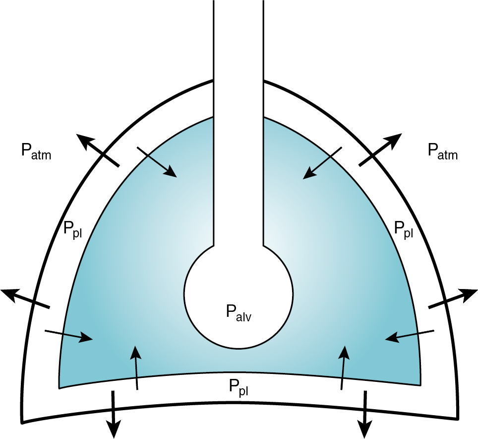Khi phổi nằm trong thành ngực, áp suất bên trong là áp suất phế nang (), trong khi áp suất bên ngoài là áp suất trong khoang màng phổi (Hình 1.2). Do đó, áp suất xuyên phổi được định nghĩa là trừ đi áp suất màng phổi (). Để có không khí trong phổi, phải âm hơn so với , dẫn đến một áp suất xuyên phổi dương.