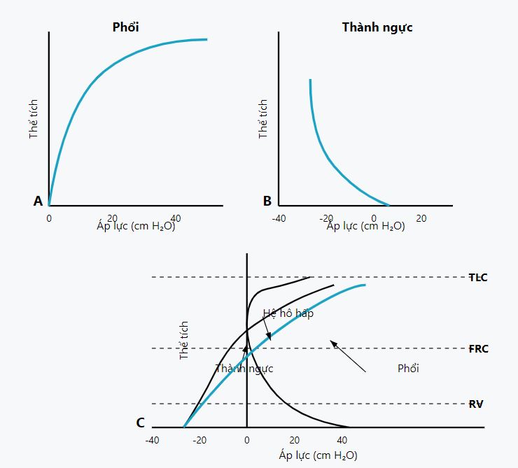 Hình 1.3 A, Mối quan hệ giữa thể tích phổi và áp suất làm giãn nở (áp suất xuyên phổi), đường cong giãn nở của phổi. B, Mối quan hệ giữa thể tích được bao bọc bởi thành ngực và áp suất làm giãn nở (áp suất qua thành ngực), đường cong giãn nở của thành ngực. C, Các đường cong giãn nở kết hợp của phổi và thành ngực cho thấy mối quan hệ giữa thể tích hệ hô hấp và áp suất làm giãn nở (áp suất qua hệ hô hấp). FRC, dung tích cặn chức năng; RV, thể tích cặn; TLC, tổng dung tích phổi.