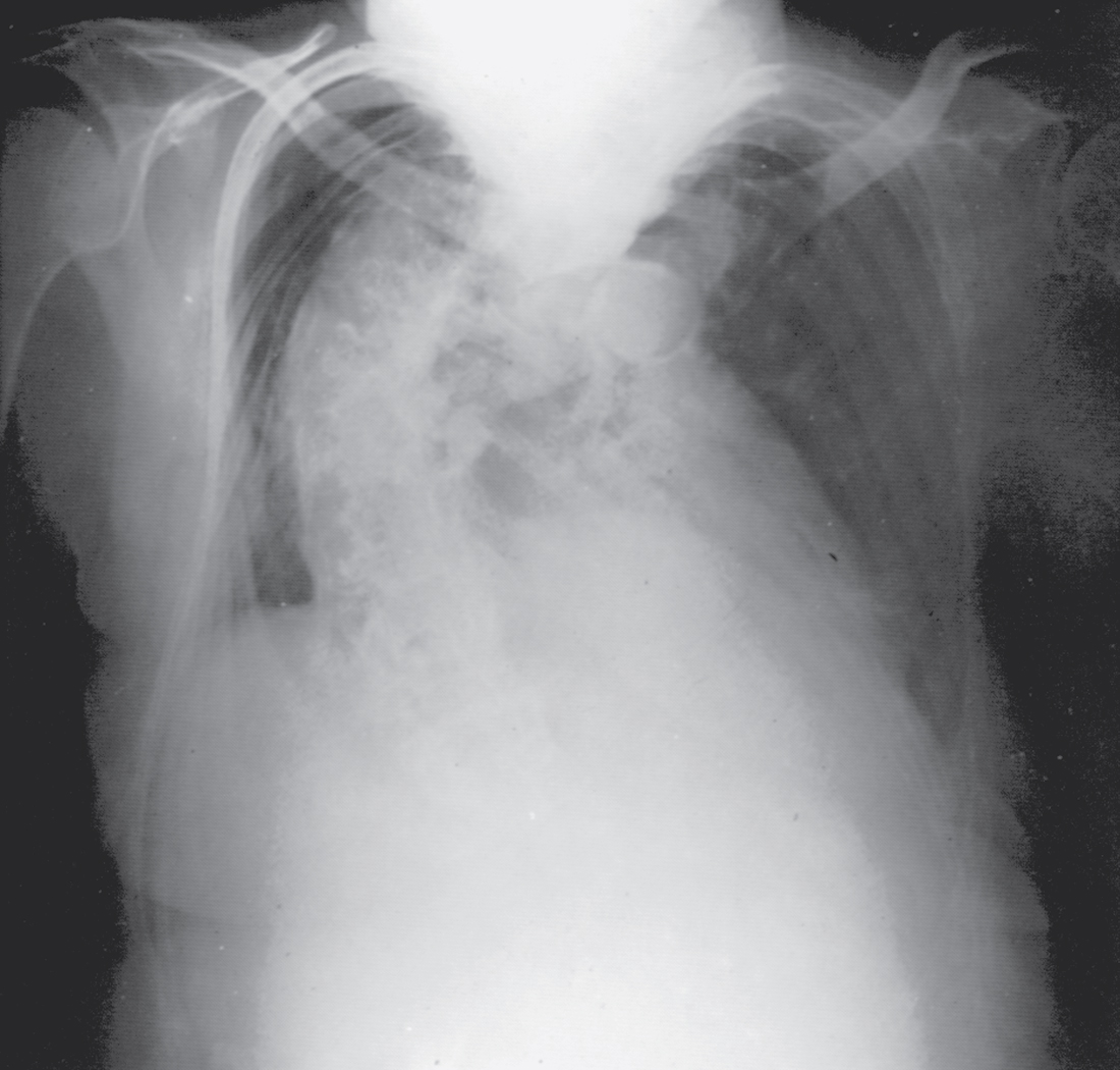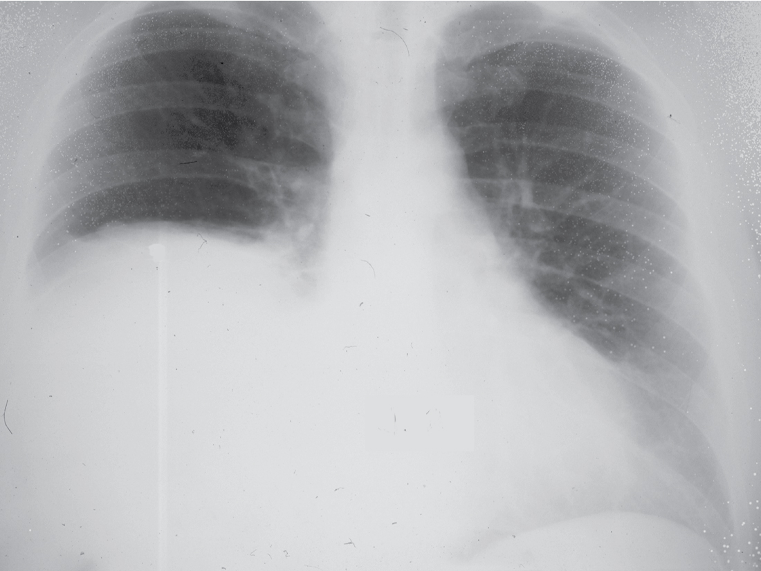 Hình 19.2. X-quang ngực cho thấy vòm hoành phải nâng cao do liệt thần kinh hoành một bên (phải).
