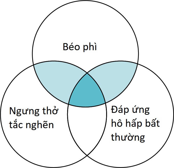 Hình 19.4. Sơ đồ Venn cho thấy giả thuyết về cách béo phì tương tác với ngưng thở tắc nghẽn và rối loạn trung tâm hô hấp. Vùng chồng chéo bên trái cho thấy bệnh nhân béo phì có PCO2 bình thường kèm ngưng thở tắc nghẽn. Vùng chồng chéo bên phải cho thấy bệnh nhân béo phì tăng CO2 máu nhưng không có ngưng thở tắc nghẽn. Vùng chồng chéo ở trung tâm cho thấy bệnh nhân béo phì tăng CO2 máu kèm ngưng thở tắc nghẽn.