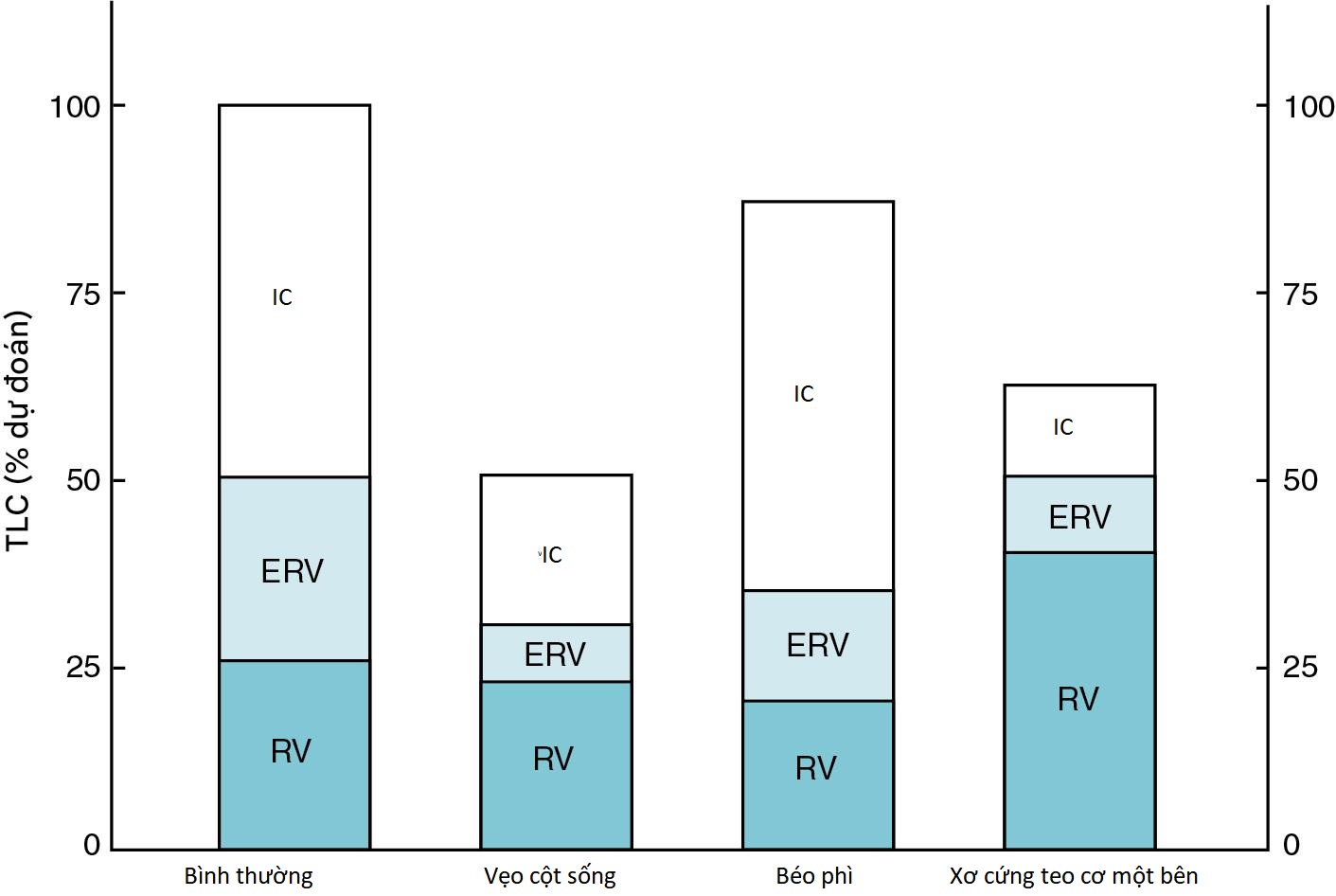 Các xét nghiệm chức năng phổi ở bệnh nhân gù vẹo cột sống đáng chú ý vì kiểu rối loạn hạn chế với sự giảm TLC. Dung tích sống giảm đáng kể, trong khi RV có xu hướng được bảo tồn tương đối. FRC, được xác định bởi sự đàn hồi ra ngoài của thành ngực cân bằng với sự đàn hồi vào trong của phổi, bị giảm vì thành ngực kém giãn nở có xu hướng đàn hồi ra ngoài giảm đi (xem Hình 19.1).
