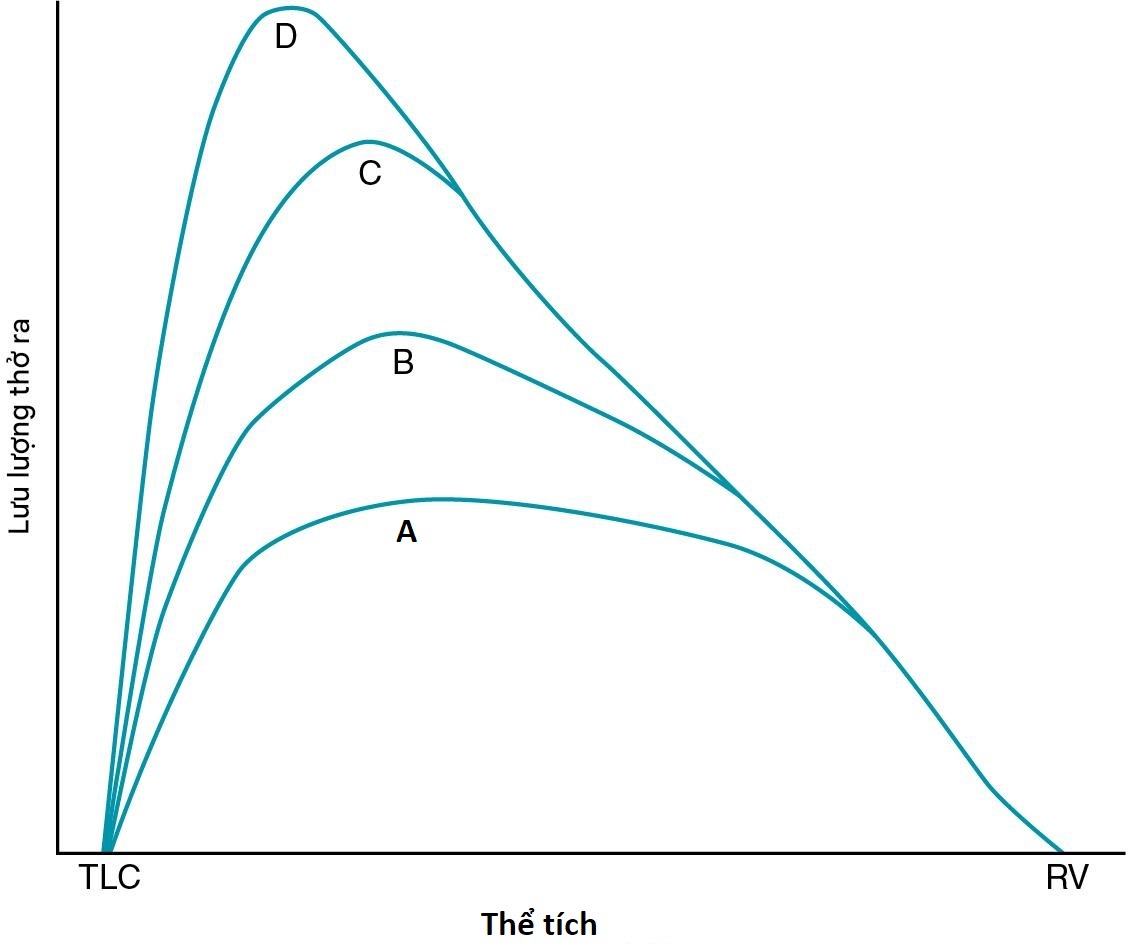 Hình 4.5 Các đường cong lưu lượng-thể tích thở ra với nỗ lực tăng dần. Đường cong A đại diện cho nỗ lực ít nhất; đường cong D đại diện cho nỗ lực thở ra tối đa. Trên phần dốc xuống của đường cong, vượt qua điểm mà khoảng 30% dung tích sống đã được thở ra, luồng khí bị giới hạn bởi các đặc tính cơ học của đường thở và phổi, không phải bởi nỗ lực của cơ. RV, thể tích khí cặn; TLC, tổng dung tích phổi.