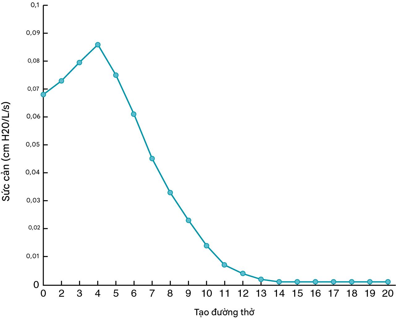 Hình 4.4 Sự đóng góp vào sức cản của các đường thở ở các cấp độ khác nhau của cây khí-phế quản. Sự đóng góp lớn nhất vào sức cản được cung cấp bởi các phế quản cỡ trung bình (thế hệ 3-5), trong khi các đường thở nhỏ hơn (khoảng thế hệ 9 trở đi) đóng góp ít hơn đáng kể vào tổng sức cản vì tổng diện tích mặt cắt ngang của chúng lớn hơn nhiều.