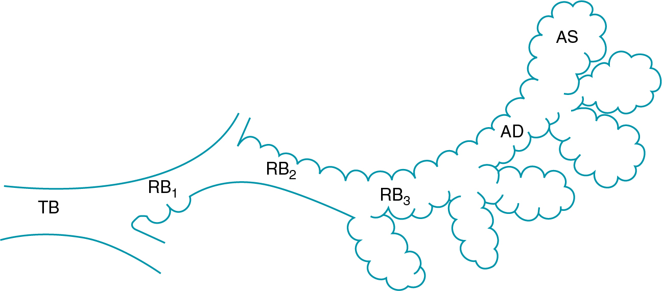 Hình 4.1 Sơ đồ phần xa nhất của cây hô hấp. Mỗi tiểu phế quản tận (TB) cung cấp cho nhiều thế hệ tiểu phế quản hô hấp (RB, từ RB₁ đến RB₃) có lớp biểu mô hô hấp (phế nang) lót thành ngày càng nhiều. Các ống phế nang (AD) được lót hoàn toàn bằng biểu mô phế nang, cũng như các túi phế nang (AS). Vùng phổi ở phía xa và được cung cấp bởi tiểu phế quản tận được gọi là chùm phế nang.