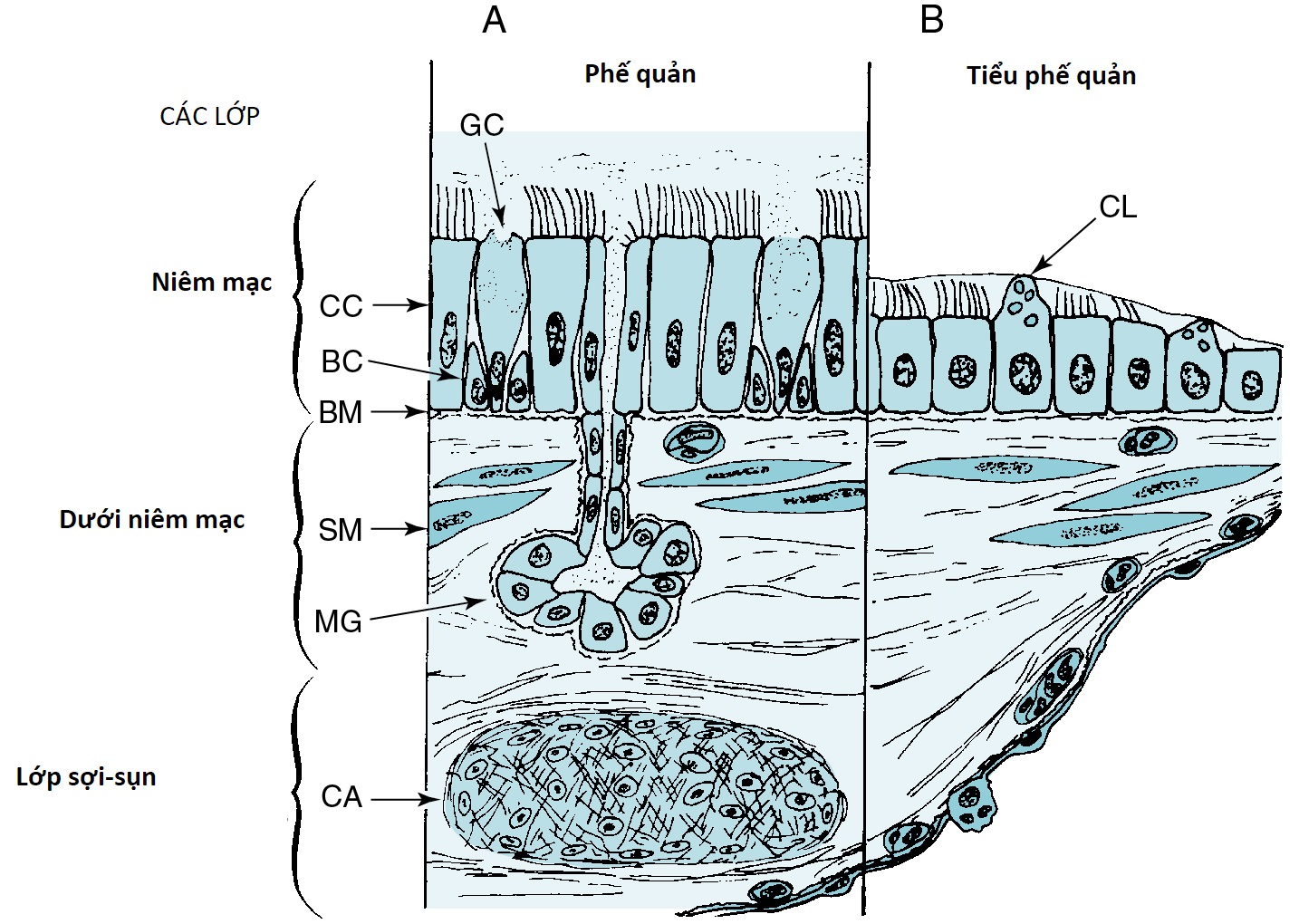 Hình 4.2 Sơ đồ các thành phần của thành đường thở. A, Cấp độ đường thở lớn (khí quản và phế quản). B, Cấp độ đường thở nhỏ (tiểu phế quản). BC, tế bào đáy; BM, màng đáy; CA, sụn; CC, tế bào biểu mô trụ có lông chuyển; CL, tế bào Club; GC, tế bào hình đài; MG, tuyến nhầy; SM, cơ trơn.