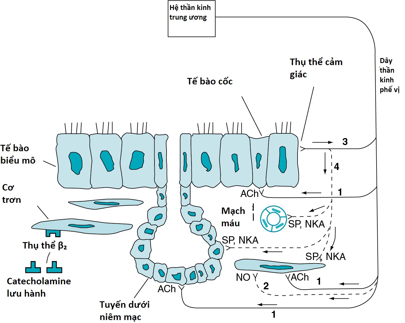 Hình 4.3 Sơ đồ kiểm soát thần kinh của đường thở. Các sợi phó giao cảm chi phối tế bào cơ trơn đường thở, tuyến dưới niêm mạc, và tế bào hình đài được đánh số 1; sự chi phối không adrenergic, không cholinergic của tế bào cơ trơn đường thở được đánh số 2; sự chi phối hướng tâm của tế bào biểu mô đường thở được đánh số 3; và luồng thần kinh dọc theo con đường được đánh số 4 đi đến dây thần kinh phế vị nhưng cũng có tác động lên tế bào cơ trơn đường thở, tuyến dưới niêm mạc, và mạch máu thông qua các phản xạ cục bộ. ACh, acetylcholine; NKA, neurokinin A; NO, nitric oxide; SP, chất P (substance P).