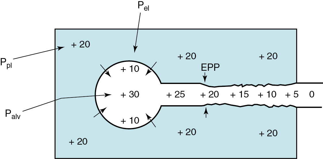 Hình 4.6 Sơ đồ khái niệm điểm áp lực bằng nhau trong một lần thở ra gắng sức (tối đa). Phế nang và đường thở của nó được hiển thị bên trong hộp, đại diện cho khoang màng phổi. Áp lực phế nang (Palv) có hai thành phần góp phần: áp lực màng phổi (Ppl) và áp lực đàn hồi của phổi (Pel). Trong sơ đồ này, Ppl=20 cm H2O và Pel=10 cm H2O, do đó Palv là tổng của Ppl và Pel, là 30 cm H2O.