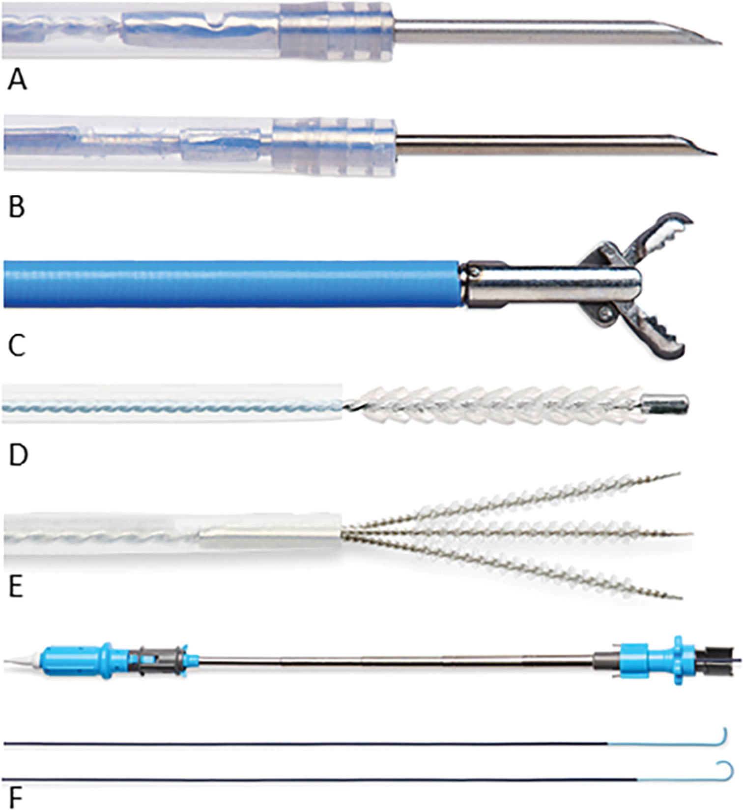 Hình 4.2 Các dụng cụ có đầu được theo dõi luôn bật của Veran. (A) Kim tế bào học 21-G ANSO có đầu được theo dõi luôn bật. (B) Kim nitinol 22-G SPIN Flex ANSO có đầu được theo dõi luôn bật. (C) Kìm sinh thiết có đầu được theo dõi luôn bật. (D) Chổi có đầu được theo dõi luôn bật. (E) Chổi ba kim có đầu được theo dõi luôn bật. (F) Catheter tiếp cận SPIN.*