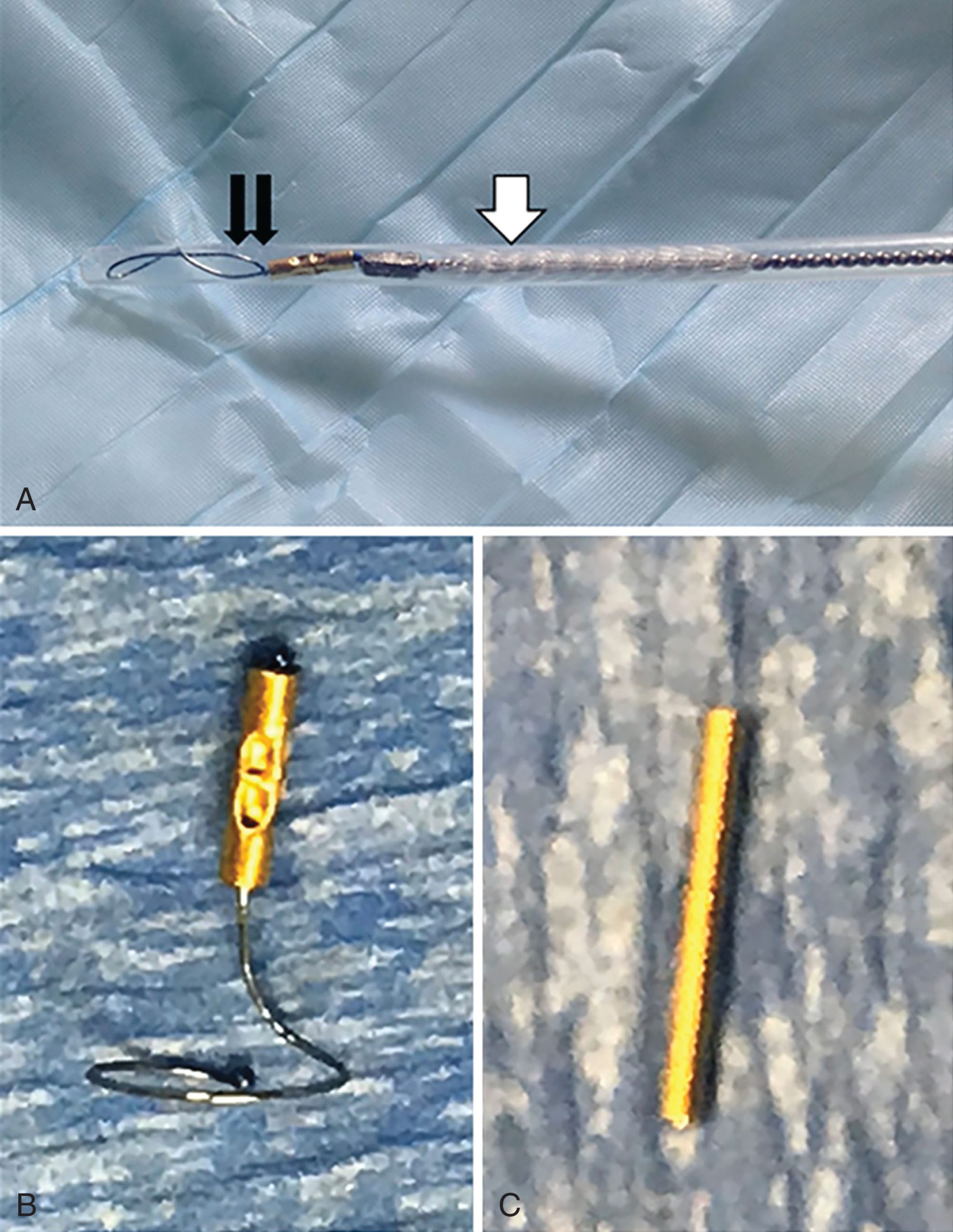 Hình 4.4 Chuẩn bị đặt điểm đánh dấu (fiducial) trong phế quản. (A) Điểm đánh dấu (mũi tên đen kép) được nạp vào chổi lấy tế bào (mũi tên trắng). (B) Điểm đánh dấu fiducial cuộn dây nitinol SuperLock. (C) Điểm đánh dấu fiducial Visicoil.*