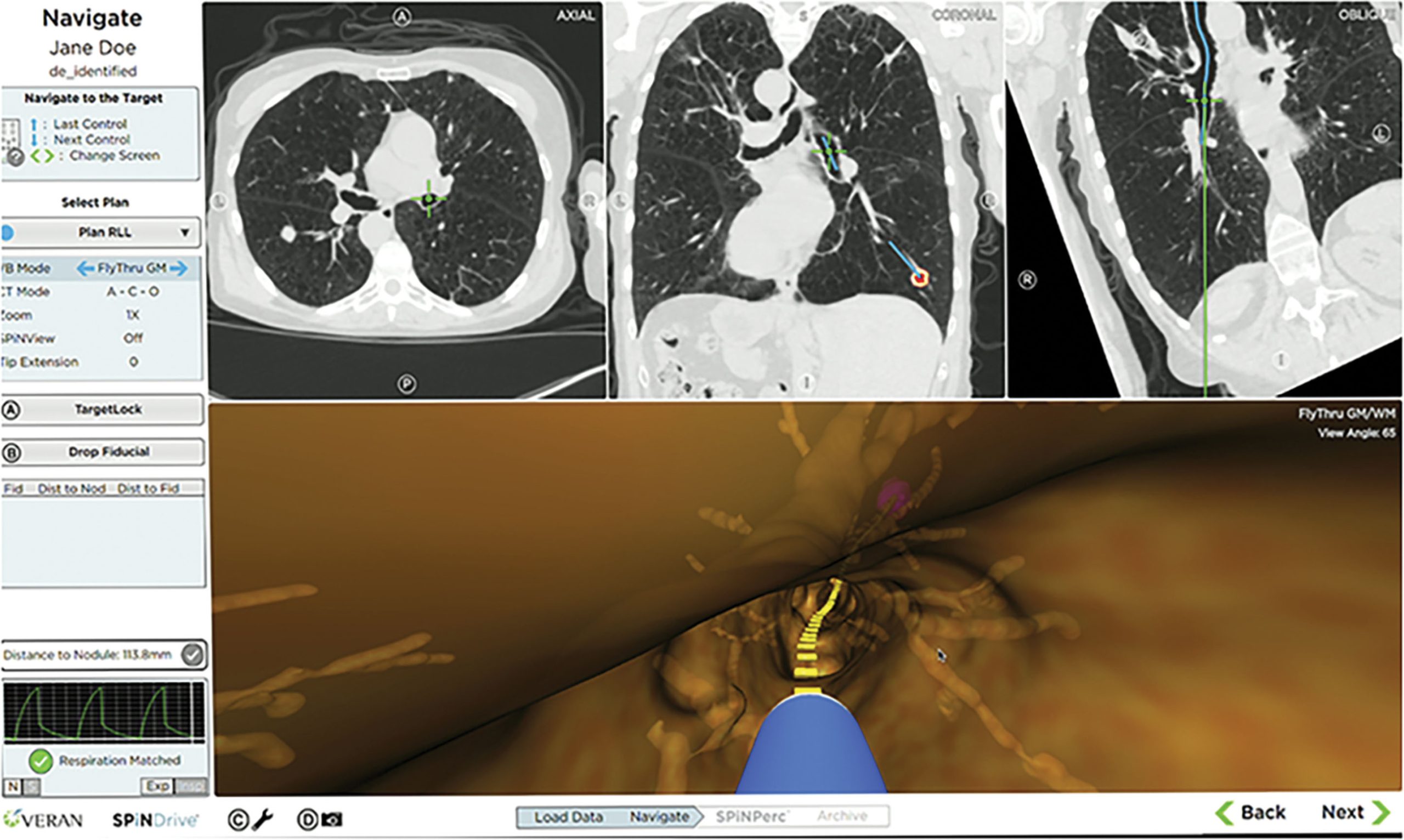 Với các tấm theo dõi bệnh nhân vPad được định vị phù hợp theo cấu hình T hoặc L, bệnh nhân được chụp CT lồng ngực không cản quang trong thì cuối hít vào và thở ra. Bệnh nhân phải giữ nguyên tư thế nằm ngửa cho đến khi hoàn thành việc chụp để giảm lỗi đăng ký. Sau khi được tải lên trạm lập kế hoạch, việc nhận dạng 6 cảm biến vPad được xác nhận (Hình 4.1). Sau đó, carina chính và carina phụ cùng bên với tổn thương cần quan tâm được đánh dấu ảo bằng cách nhấp chuột phải vào carina tương ứng trên bản đồ đường thở do chương trình tạo ra. Tổn thương cần quan tâm sau đó được chọn bằng cách nhấp chuột phải, giữ và kéo qua đường kính lớn nhất của tổn thương và nhấp vào lưu. Phần mềm sau đó sẽ phân đoạn tổn thương mục tiêu và đường thở, tạo ra một bản đồ đường thở ảo độ nét cao với một đường đi được đề xuất đến tổn thương. Sau đó, người dùng sẽ xác nhận đăng ký bằng cách đánh giá lớp phủ của định vị đã lập kế hoạch trên hình ảnh thì thở ra. Nếu có sự phân kỳ đáng kể giữa đường đi đã lập kế hoạch và hình ảnh thì thở ra, điều này được khắc phục bằng cách chọn nút “tinh chỉnh đường thở”, căn chỉnh hình ảnh thì hít vào và thở ra cạnh nhau, và thả một điểm trên carina chính trên hình ảnh thì thở ra bằng cách nhấp chuột phải, sau đó đặt một điểm thứ hai trên tổn thương cần quan tâm trên hình ảnh thì thở ra bằng một cú nhấp chuột phải. Phần mềm sau đó điều chỉnh lớp phủ, người dùng xác nhận khi đã phù hợp. Màn hình tiếp theo là giai đoạn lập kế hoạch SPIN Perc, có thể bỏ qua nếu muốn hoặc nếu vị trí mục tiêu không phù hợp để lấy mẫu qua da.