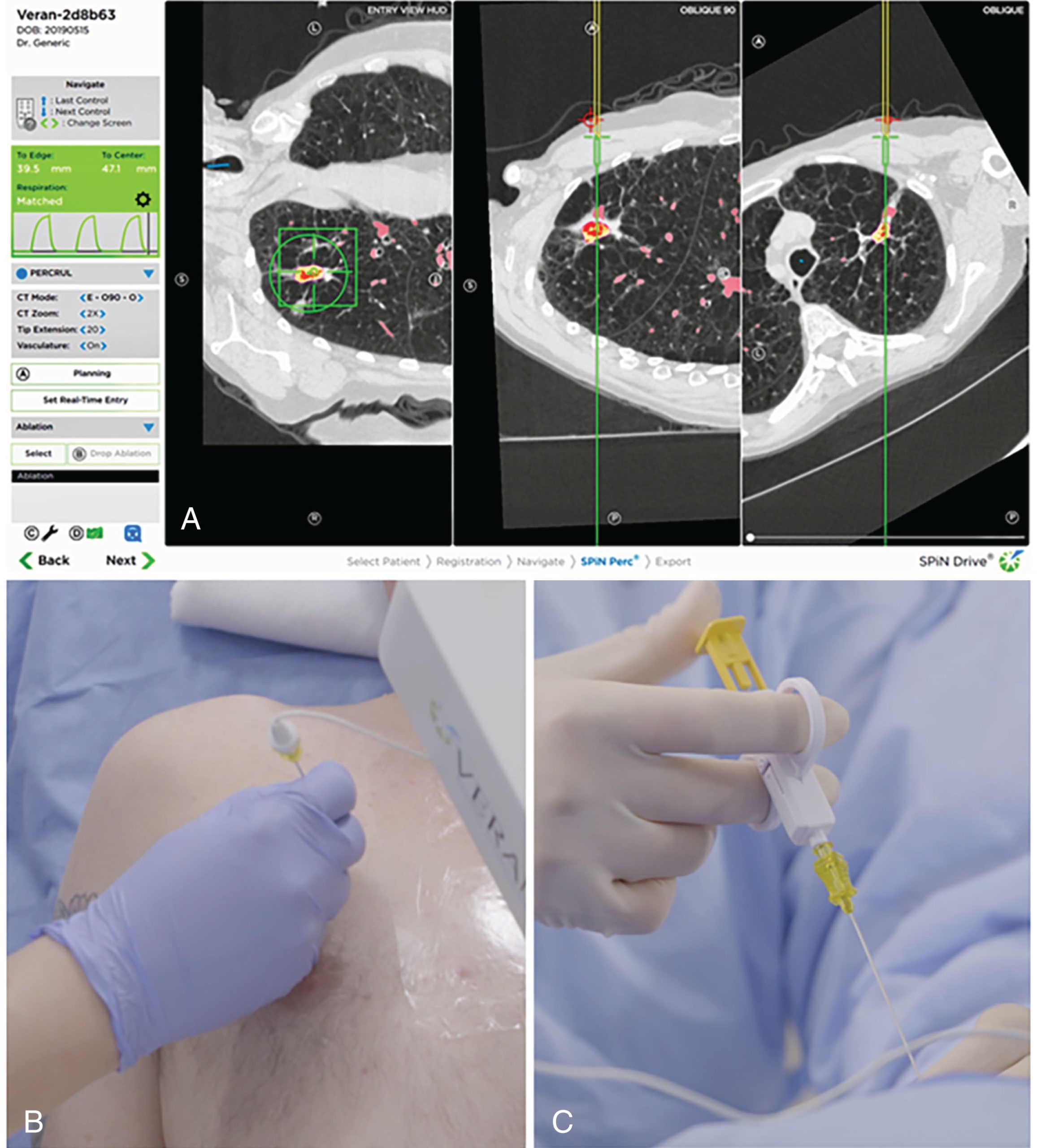 Nếu nốt nằm ở một phần ba ngoại vi của nhu mô phổi và ở vị trí trước-bên, thì có thể xem xét chọc hút/sinh thiết kim xuyên thành ngực có dẫn đường bằng điện từ (EMTTNA). Khi lập kế hoạch cho EMTTNA, một vị trí chọc kim được chọn bằng cách nhấp chuột phải ở ngang mức da sao cho đường vào của kim được tạo ra là khoảng cách ngắn nhất từ lá tạng màng phổi đến mục tiêu và tránh các cấu trúc xương nằm trên, rãnh liên thùy, và cách vị trí chọc kim đến tổn thương mục tiêu dưới 10,5 đến 15,5 cm (khoảng cách làm việc của các kim TTNA có đầu được theo dõi luôn bật SPIN Perc có sẵn). Kế hoạch sau đó được tải lên ổ USB, mang đến nền tảng định vị SPIN Drive và tải lên.