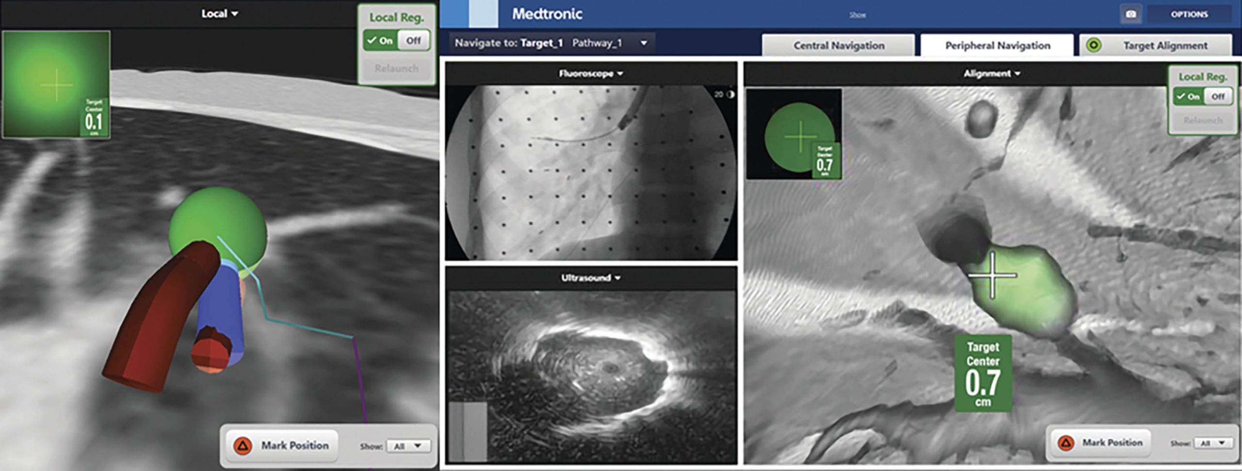 Khi đăng ký đường thở được xác nhận, giai đoạn định vị của thủ thuật bắt đầu (Hình 4.5). Sử dụng một cây kim có đầu được theo dõi được đặt ở cuối kênh làm việc của ống nội soi phế quản, người thực hiện thủ thuật điều khiển ống nội soi phế quản theo lộ trình ảo và kiến thức của người thực hiện về vị trí giải phẫu của tổn thương mục tiêu. Mục tiêu sẽ có màu tím cho đến khi dụng cụ cách tổn thương trong vòng 1 cm và được căn chỉnh sao cho tổn thương nằm trong đường đi của kim, lúc đó nó sẽ chuyển sang màu cam. Tổn thương sẽ chuyển sang màu xanh lá cây khi đầu kim ảo nằm trong mục tiêu. Một bác sĩ, kỹ thuật viên hoặc điều dưỡng phụ tá sẽ đẩy kim ra trong thì thở ra. Khi kim đã được triển khai, có thể áp dụng lực hút khi kim được khuấy động trong tổn thương trong thì thở ra – “xanh trên xanh” (khi đầu dụng cụ ảo nằm trong tổn thương và hệ thống cảm nhận rằng chu kỳ hô hấp đang ở thì thở ra). Sau khoảng 10 lần khuấy động, ngừng hút và rút kim. Rút dụng cụ ra khỏi kênh làm việc và xử lý mẫu theo quy trình của cơ sở. Khi sử dụng kìm sinh thiết có đầu được theo dõi luôn bật, chúng tôi khuyên nên mở kìm ở rìa gần của biểu diễn ảo của tổn thương (khi tổn thương có màu cam), đẩy kìm đang mở vào tổn thương trong thì thở ra và đóng hàm kìm trong lúc “xanh trên xanh”. Chải xuyên phế quản có thể được thực hiện theo cách tương tự.