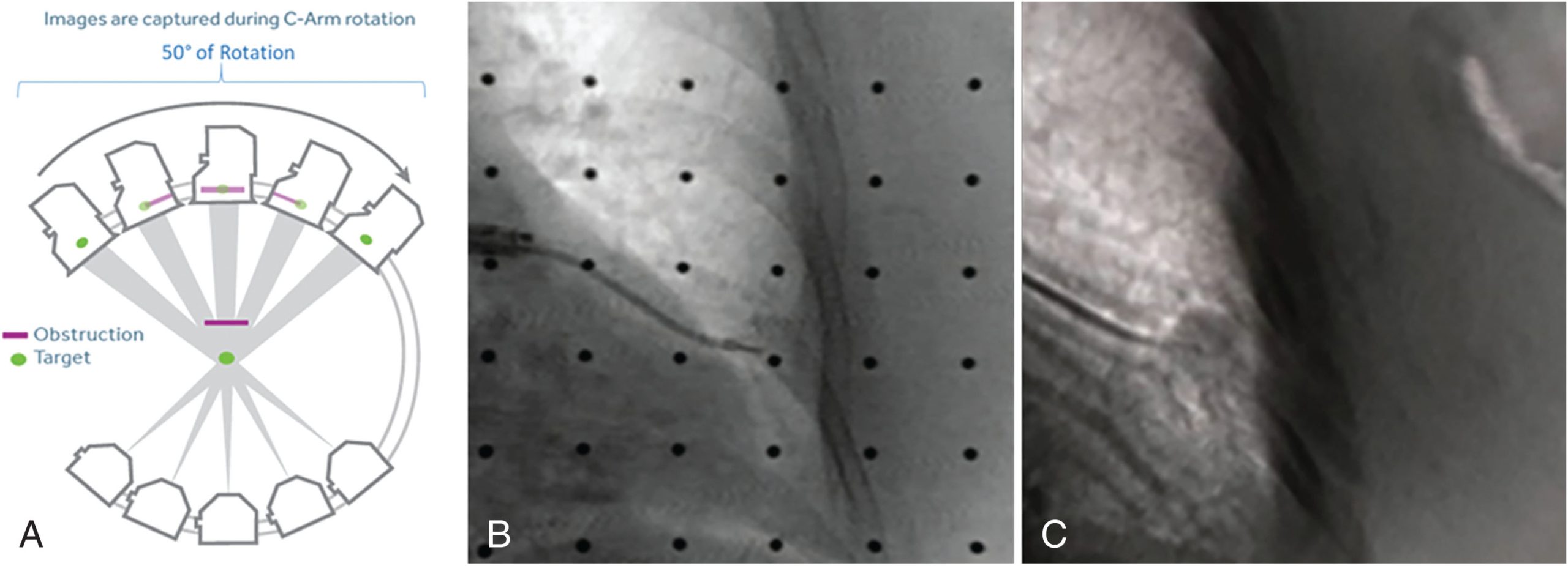 Hình 4.8 Công nghệ định vị bằng soi huỳnh quang. (A) Một cung hình ảnh 50 độ được thu thập xung quanh vùng mục tiêu. (B) Hình ảnh soi huỳnh quang với bảng fiducial và kênh làm việc mở rộng (EWC) trước khi sử dụng công nghệ tăng cường hình ảnh của superDimension. (C) Hình ảnh soi huỳnh quang sau khi sử dụng công nghệ tăng cường hình ảnh của superDimension.*