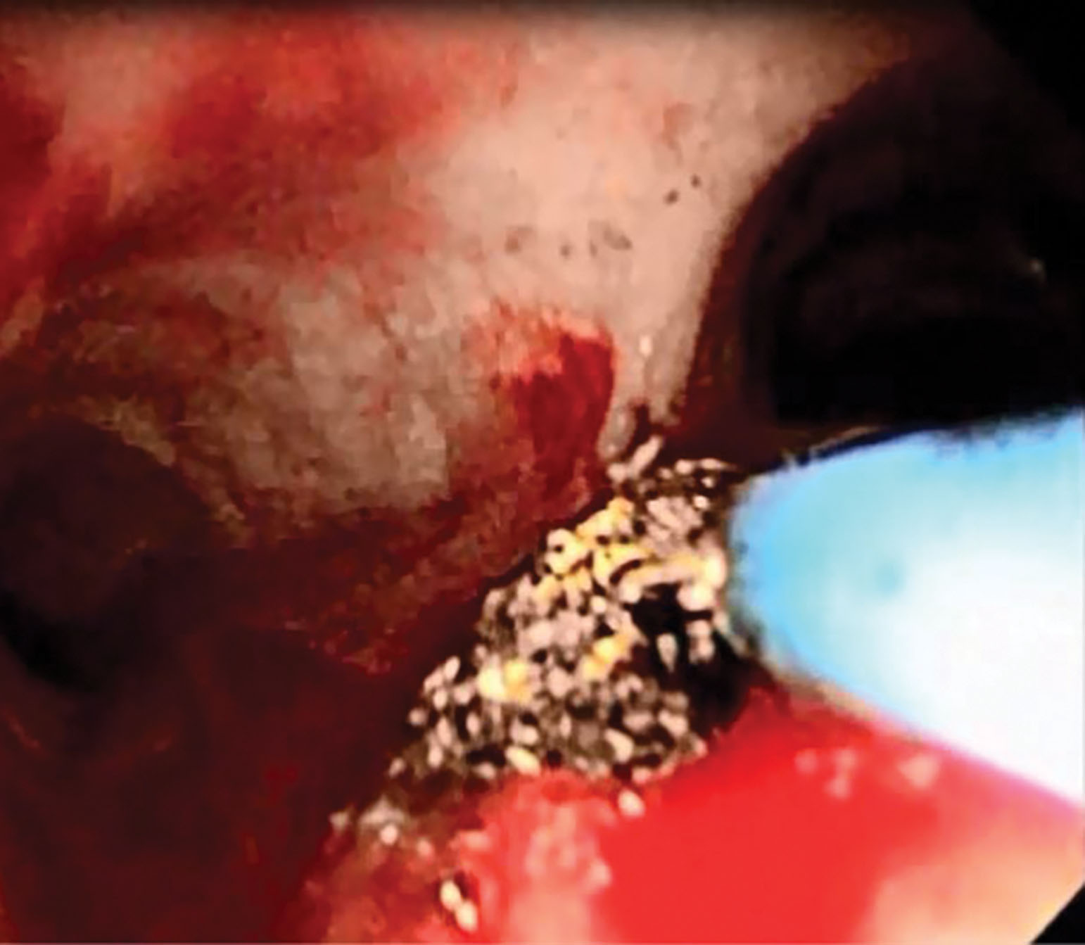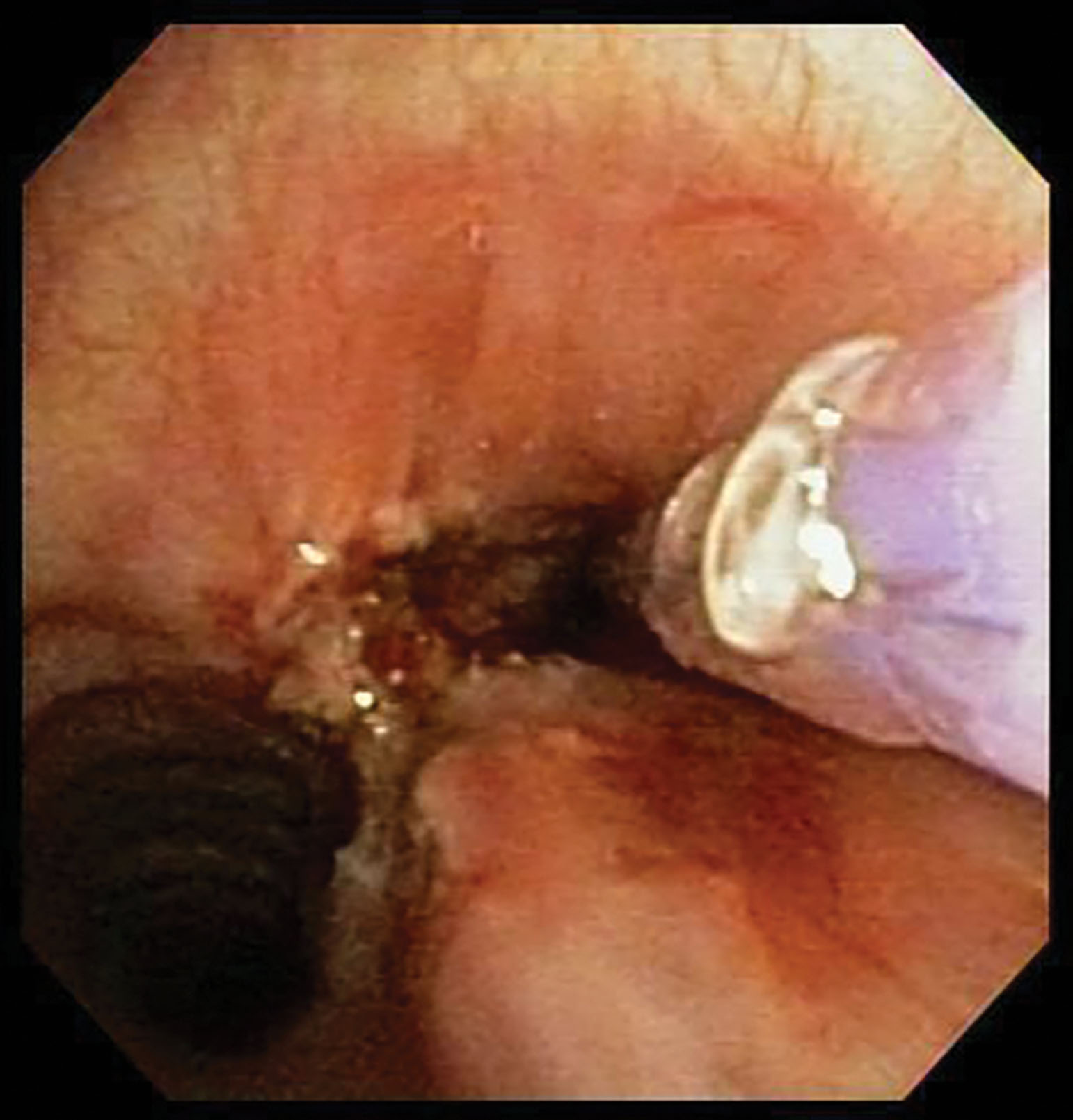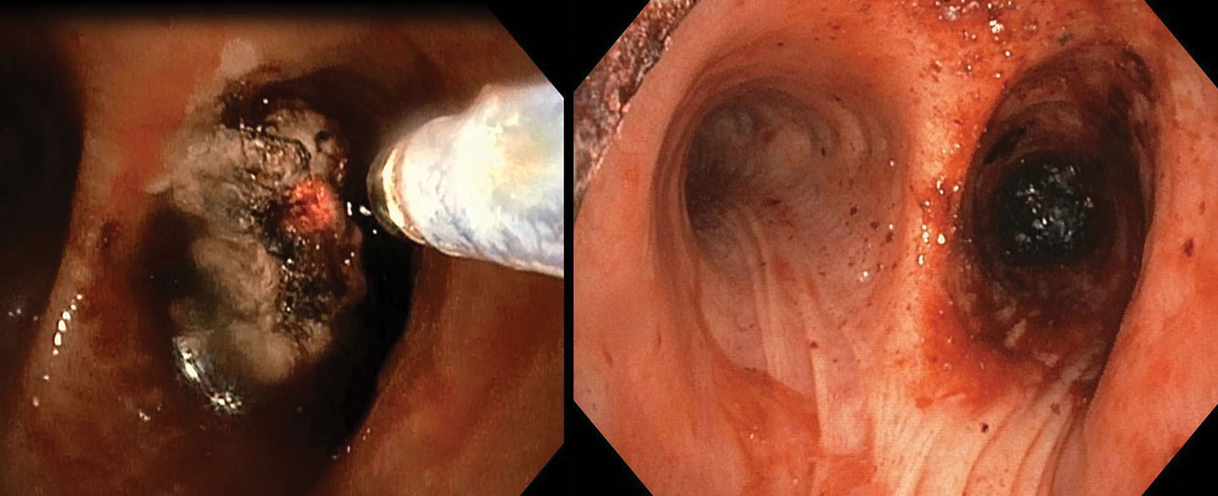 Hình 8.1 Cắt đốt bằng quang đông laser Neodymium:yttrium aluminum perovskite đối với ung thư phổi không tế bào nhỏ gây tắc nghẽn phế quản gốc phải.