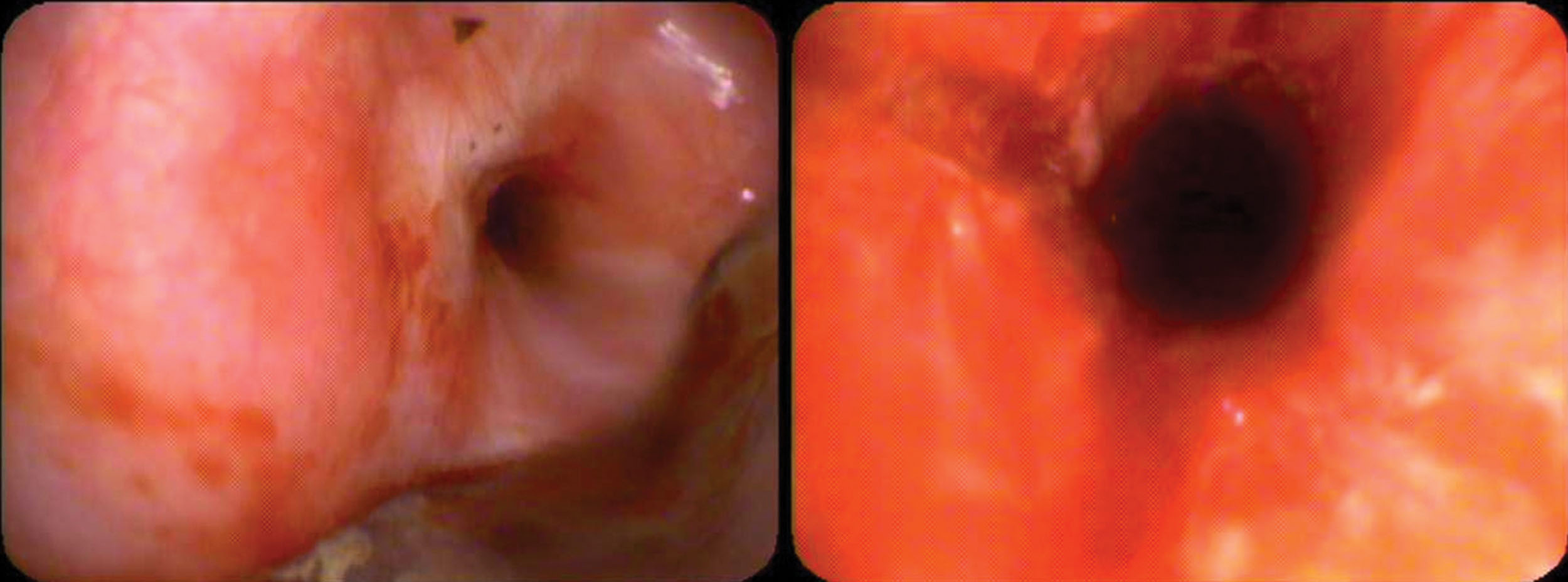 Hình 8.4 Hẹp dưới thanh môn lành tính trước và sau khi điều trị bằng các vết cắt xuyên tâm sử dụng dao cắt điện. (Ảnh do tác giả cung cấp, được sử dụng với sự cho phép.)