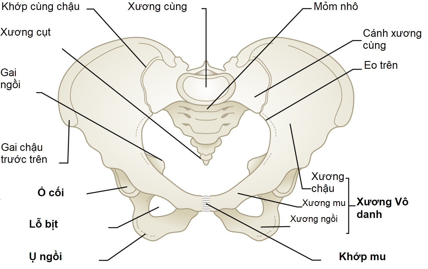 Khung chậu xương bao gồm cặp xương vô danh (mỗi xương gồm xương chậu, xương ngồi và xương mu) cùng với xương cùng và xương cụt (Hình 1.1).