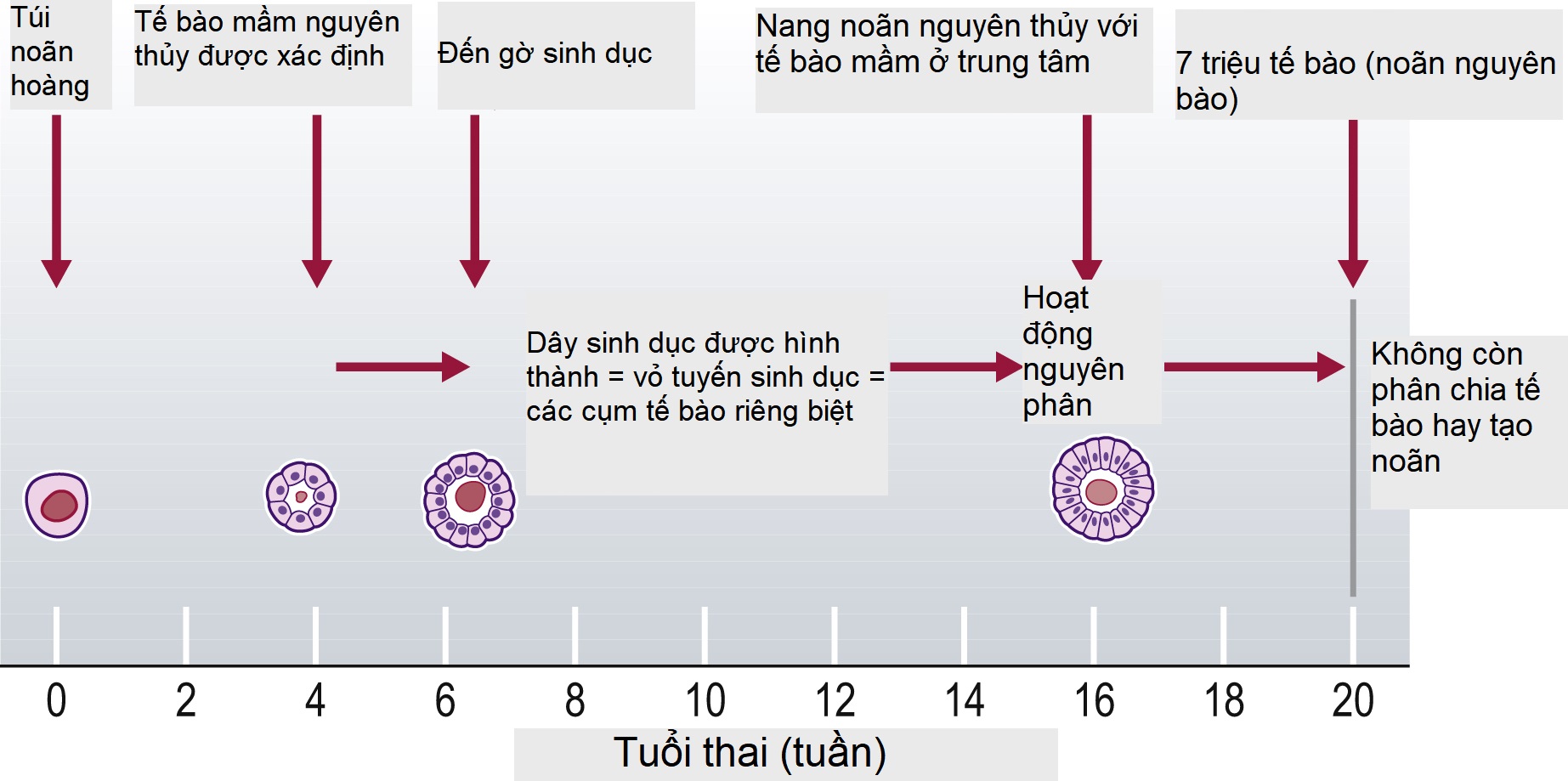 Các tế bào mầm nguyên thủy (primordial germ cells) ban đầu xuất hiện trong túi noãn hoàng và có thể được xác định vào tuần thứ tư của quá trình phát triển của thai nhi (Hình 2.1). Các tế bào này di chuyển qua mạc treo ruột sau của ruột đang phát triển và cuối cùng đến gờ sinh dục (genital ridge) trong khoảng từ 44 đến 48 ngày sau khi thụ thai. Các tế bào này di chuyển đến mấu sinh dục, một cấu trúc gồm các tế bào trung mô nằm ở mặt bụng của trung thận (mesonephros). Các tế bào mầm tạo thành các dây sinh dục và trở thành vỏ của buồng trứng.