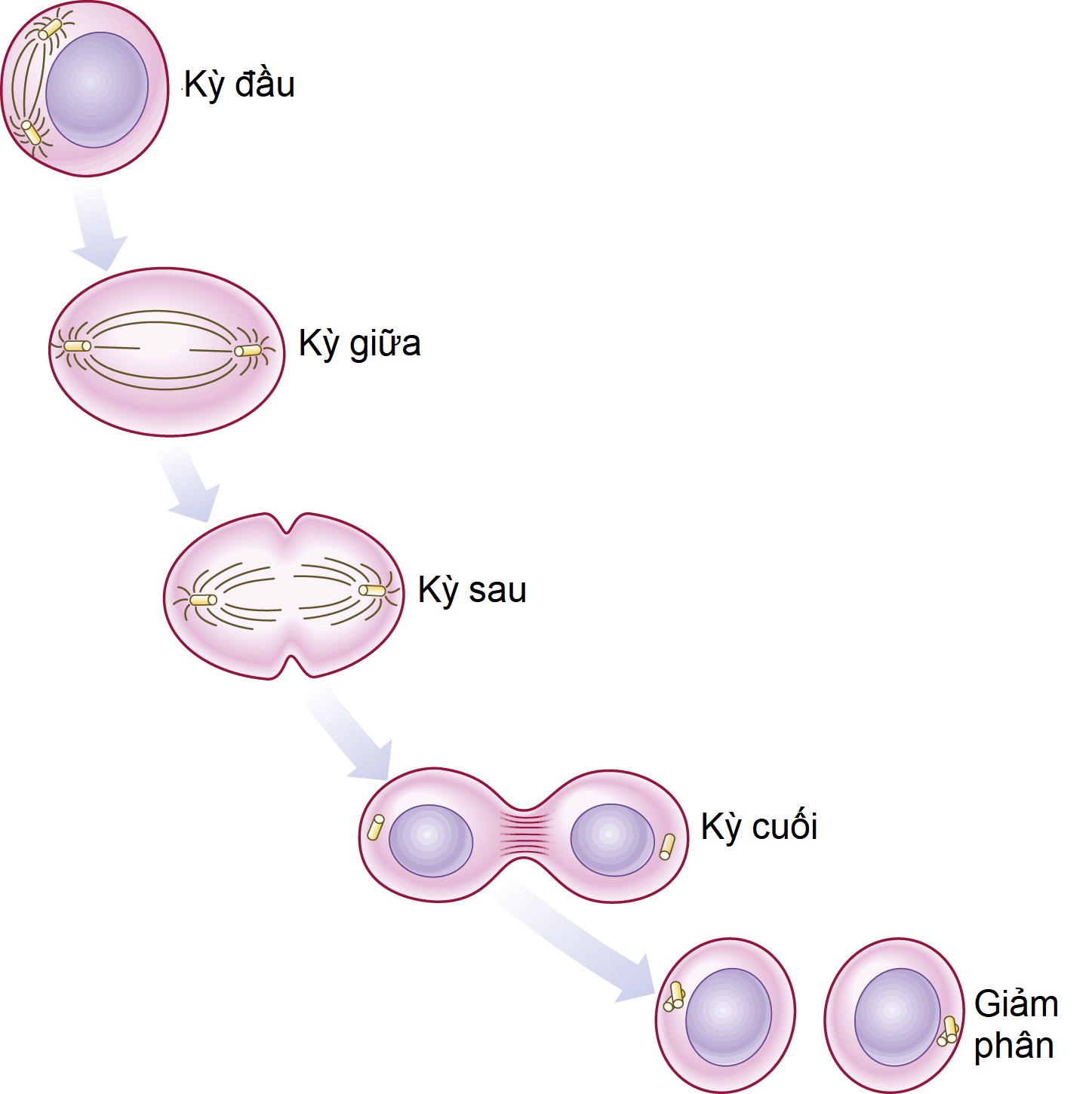 Trong giảm phân, hai lần phân chia tế bào xảy ra liên tiếp, mỗi lần bao gồm kỳ đầu, kỳ giữa, kỳ sau và kỳ cuối. Lần phân chia tế bào đầu tiên là phân chia giảm nhiễm, và lần thứ hai là một quá trình nguyên phân đã được biến đổi trong đó kỳ đầu thường không có (Hình 2.2). Vào cuối kỳ đầu của giảm phân I, các nhiễm sắc thể kép trải qua quá trình tiếp hợp (synapsis), tạo ra một nhóm bốn nhiễm sắc tử tương đồng được gọi là thể tứ nhiễm (tetrad). Hai trung tử di chuyển đến các cực đối diện. Một thoi phân bào hình thành ở giữa, và màng nhân biến mất. Trong giai đoạn kỳ đầu của giảm phân I, các nhiễm sắc thể kép, được liên kết chặt chẽ thành từng cặp dọc theo toàn bộ chiều dài của chúng, trải qua quá trình tiếp hợp, bắt chéo và trao đổi nhiễm sắc tử, những quá trình này giải thích cho sự khác biệt được thấy giữa hai anh chị em cùng giới tính mặc dù các giao tử cái đến từ cùng một người mẹ.