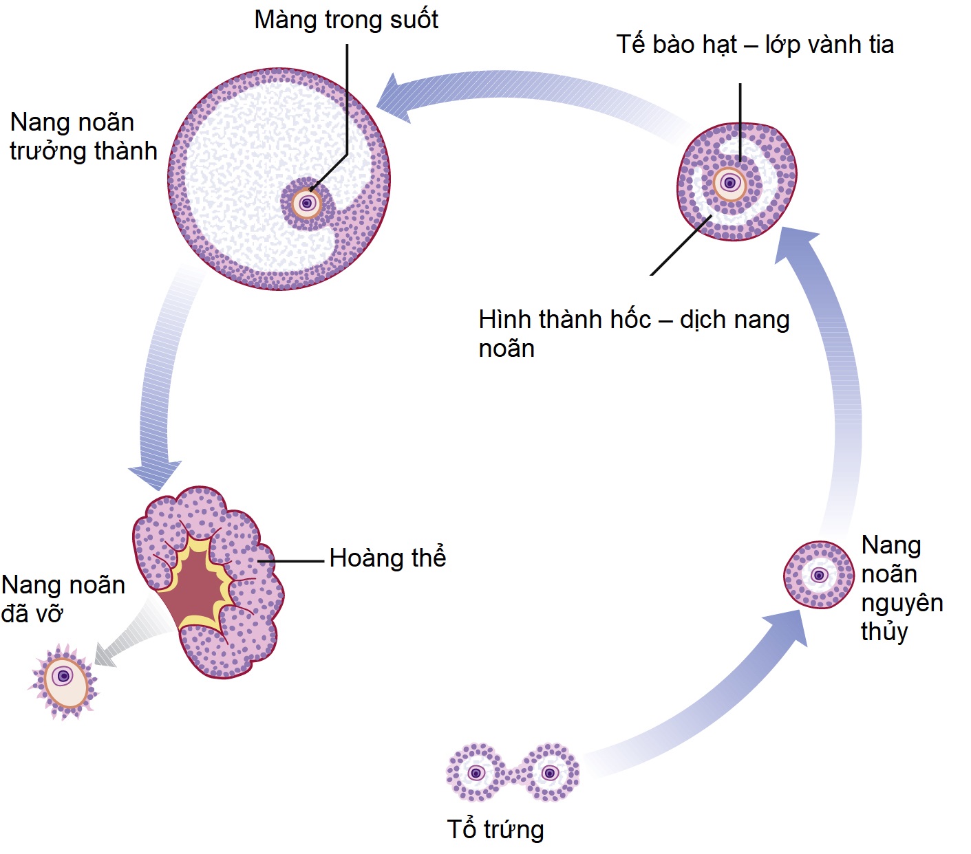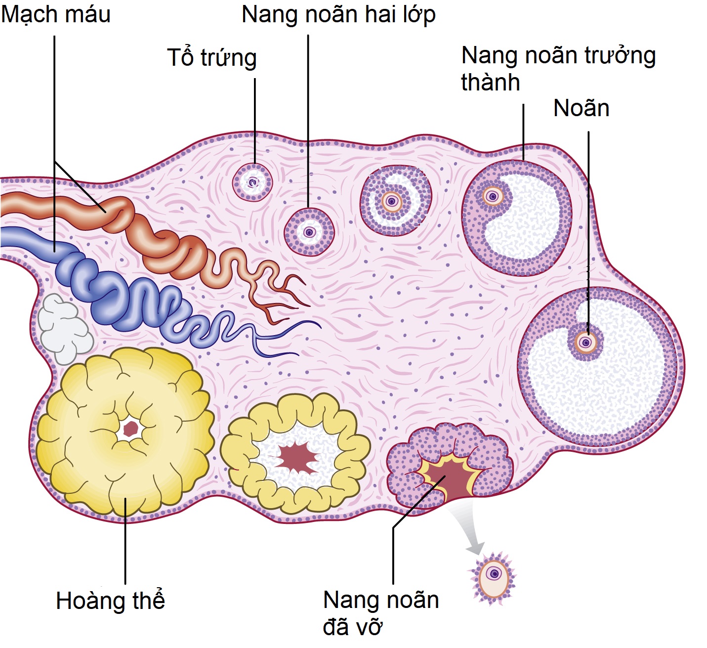 Hình 2.2 Các noãn bào bậc một vẫn ở trạng thái kỳ đầu treo. Quá trình giảm phân tiếp tục lại dưới sự kích thích của hormone hoàng thể hóa.