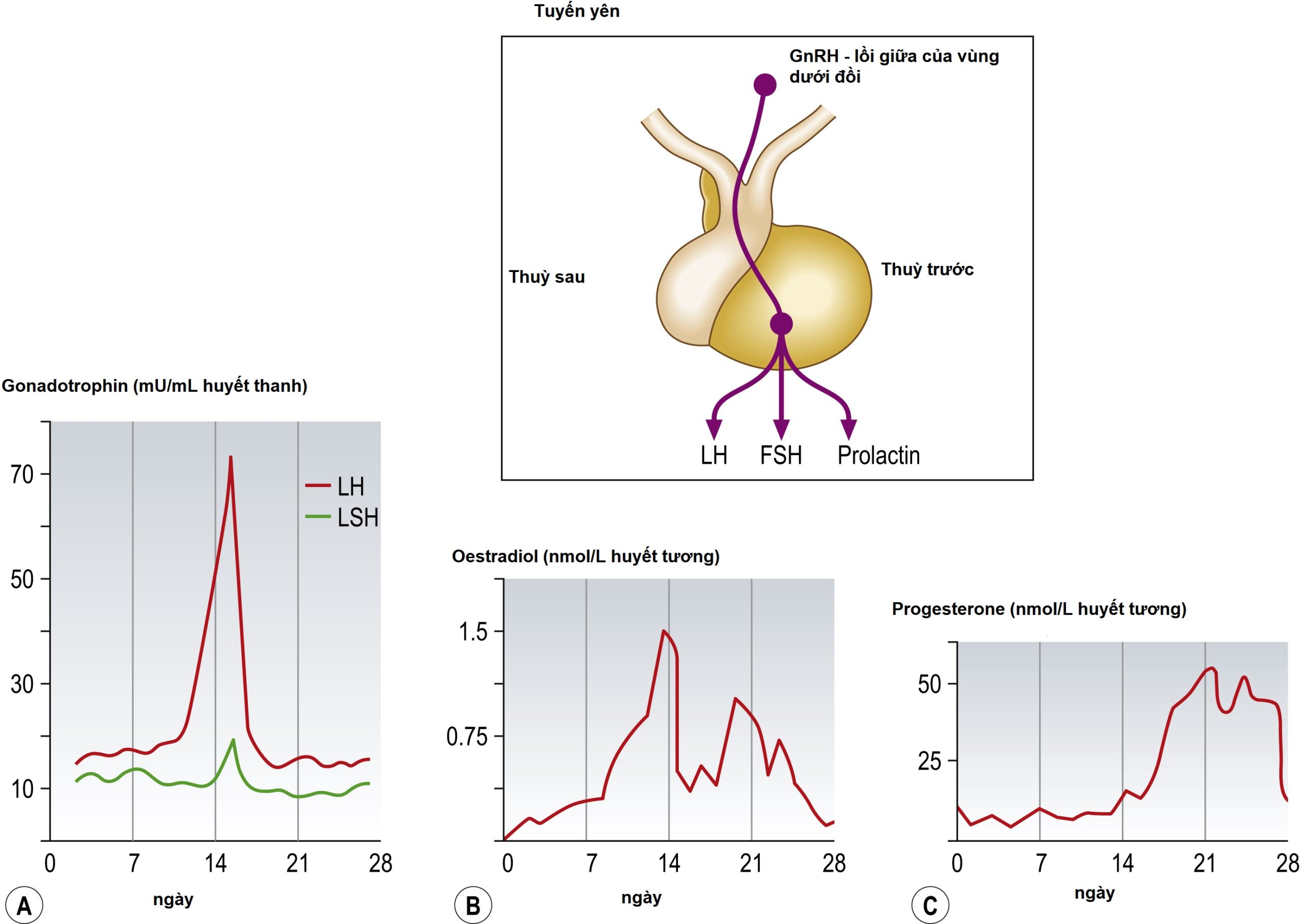Ba hormone chính liên quan đến sinh sản được sản xuất bởi thùy trước của tuyến yên hay tuyến yên trước (adenohypophysis) và bao gồm FSH, LH và prolactin. Nồng độ FSH trong máu cao hơn một chút trong thời gian hành kinh và sau đó giảm do tác động phản hồi âm của việc sản xuất oestrogen bởi nang noãn vượt trội. Nồng độ LH dường như duy trì ở mức tương đối ổn định trong nửa đầu của chu kỳ; tuy nhiên, có một đợt tăng đột biến rõ rệt của LH từ 35-42 giờ trước khi rụng trứng và một đỉnh FSH trùng hợp nhỏ hơn (xem Hình 2.5). Đỉnh LH thực chất được tạo thành từ hai đợt tăng đột biến gần nhau, và một đỉnh nồng độ oestradiol huyết tương xảy ra trước đỉnh LH. Nồng độ LH và FSH huyết tương thấp hơn một chút trong nửa sau của chu kỳ so với giai đoạn trước rụng trứng, nhưng việc giải phóng LH liên tục của tuyến yên là cần thiết cho chức năng bình thường của hoàng thể. Pituitary gonadotropins ảnh hưởng đến hoạt động của vùng dưới đồi bằng một hệ thống phản hồi vòng ngắn giữa chính các gonadotropin và tác động của các hormone buồng trứng được sản xuất do hoạt động của FSH và LH trên buồng trứng.